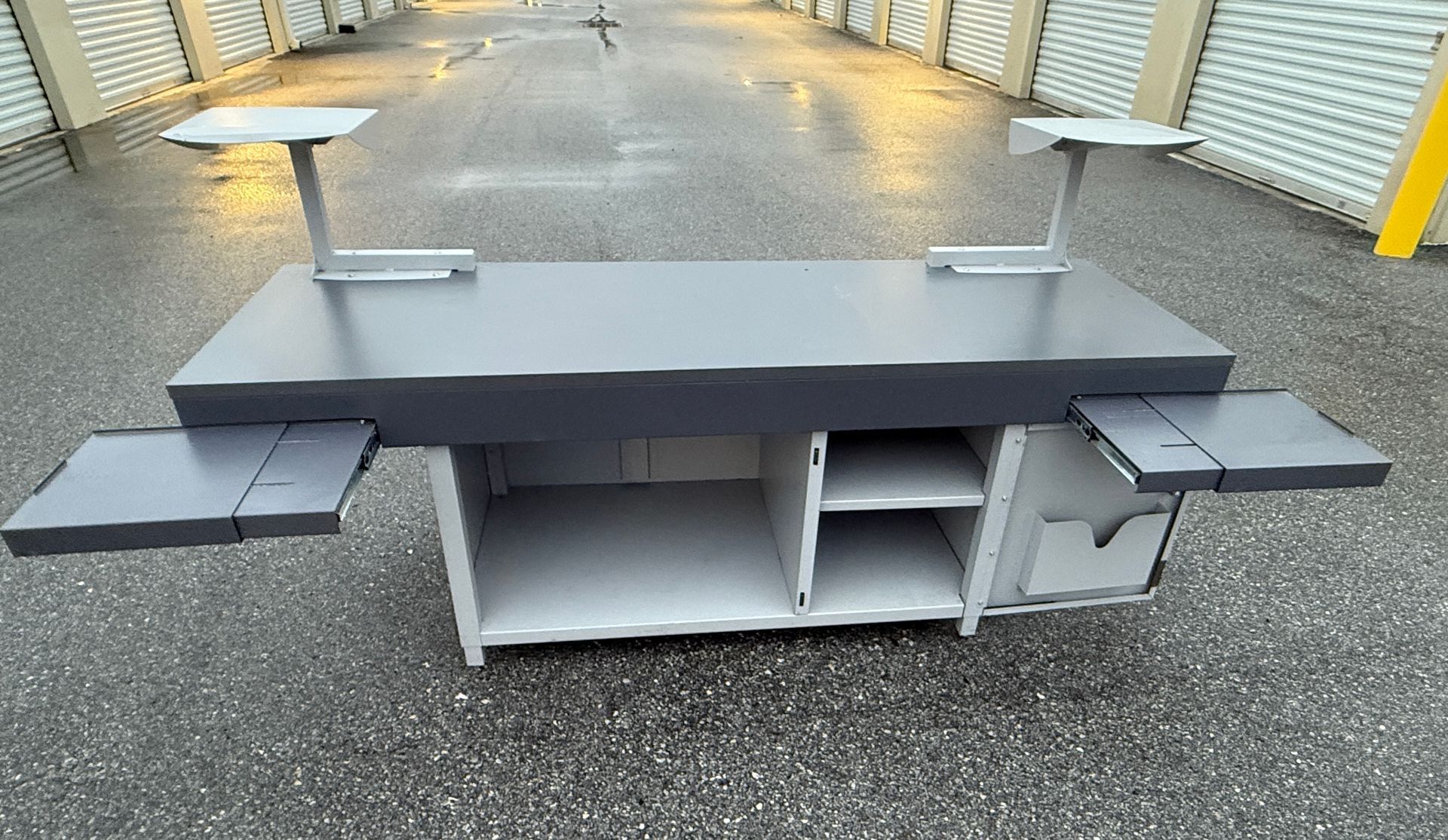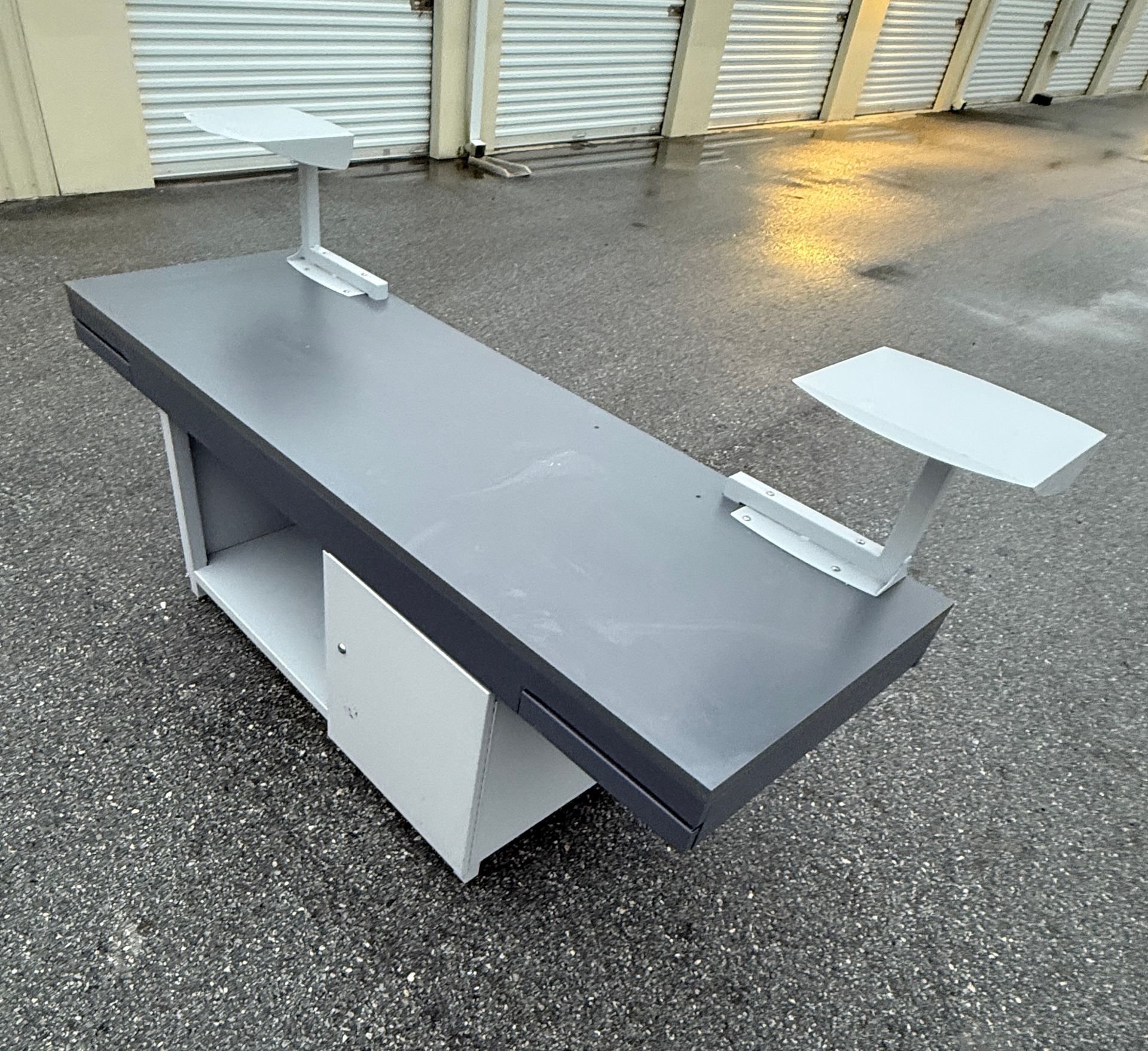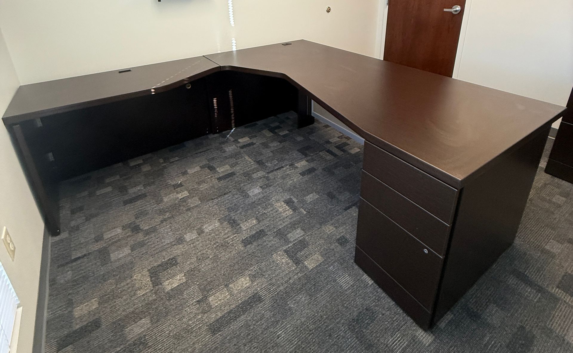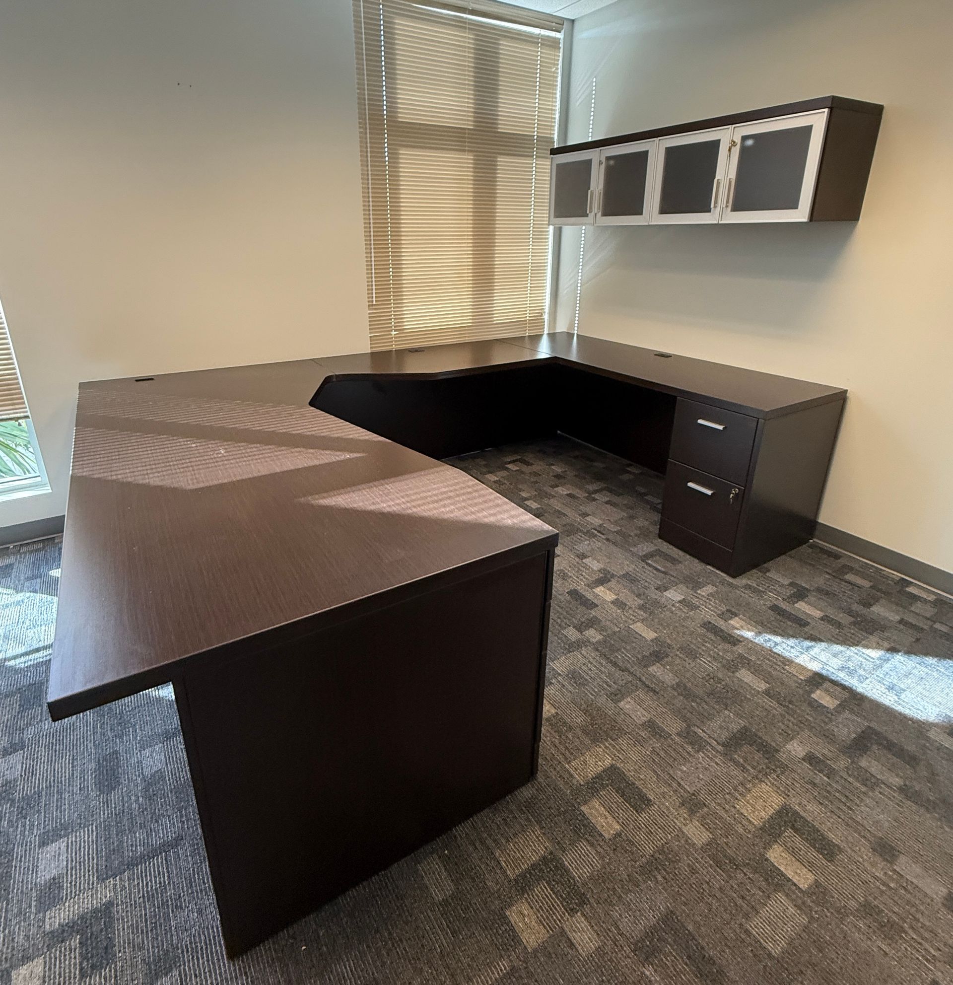 (3) U shaped with D tops with storage, (1) L Shaped with storage, (2) 2D Lats, (1) Boockase