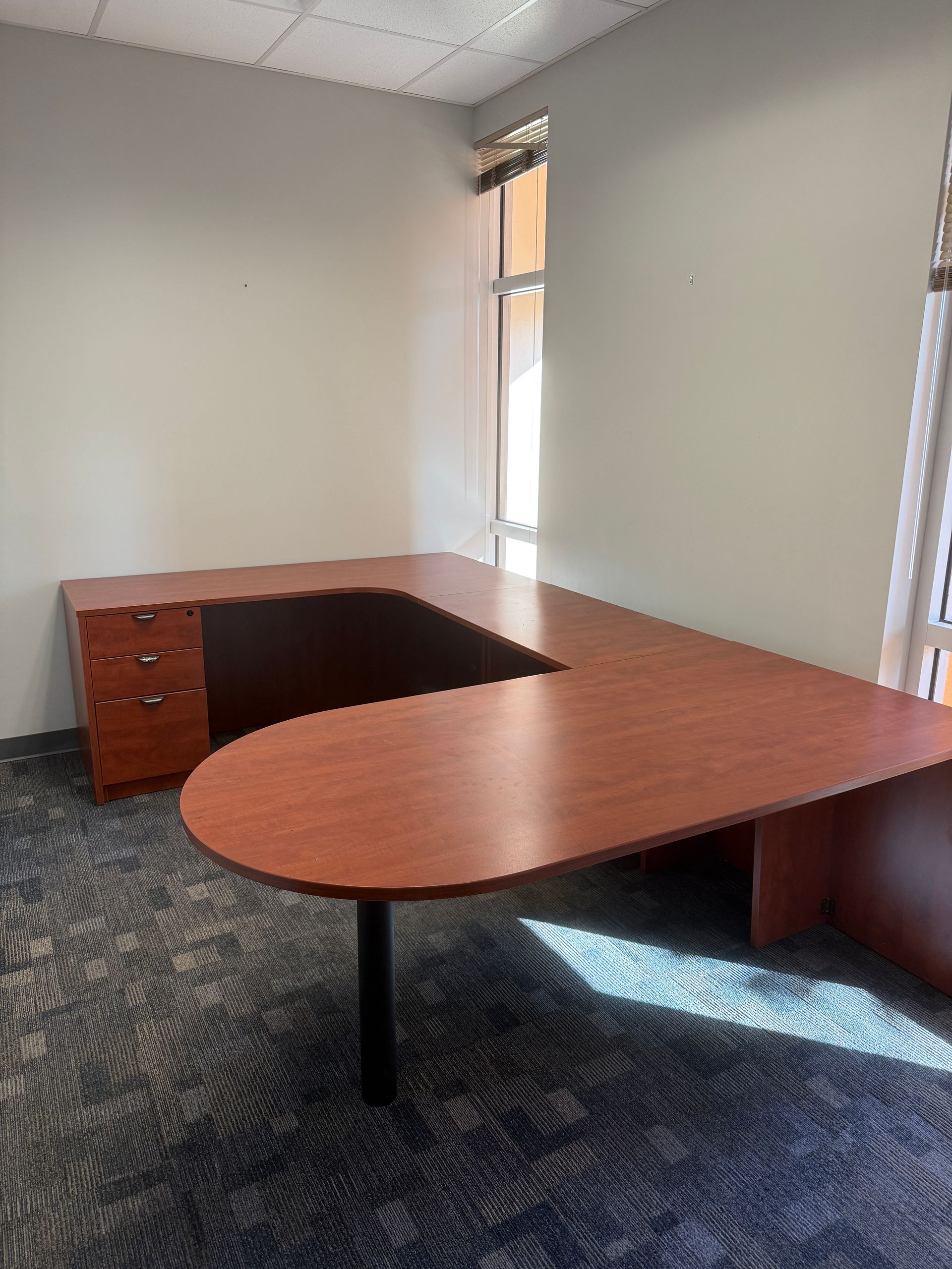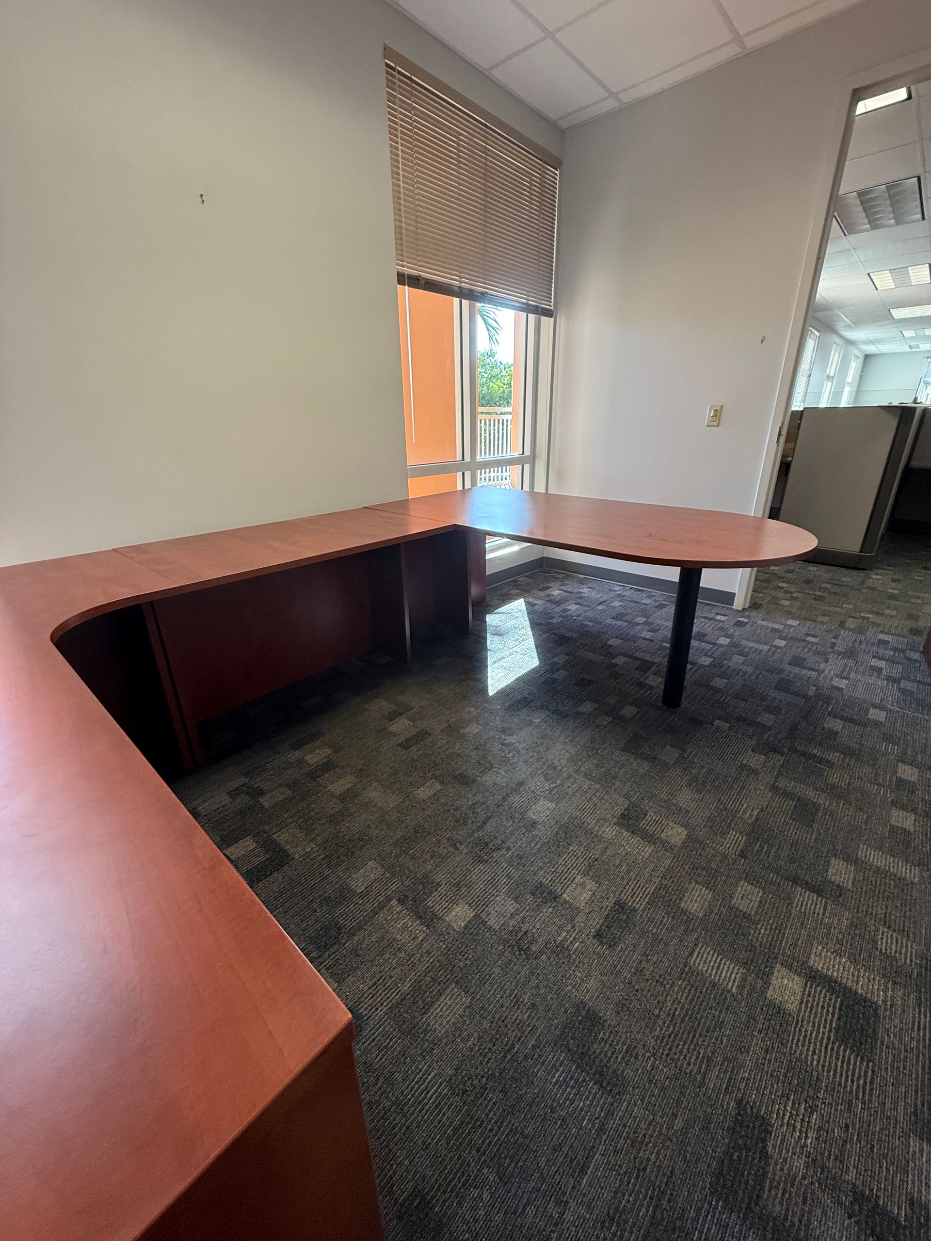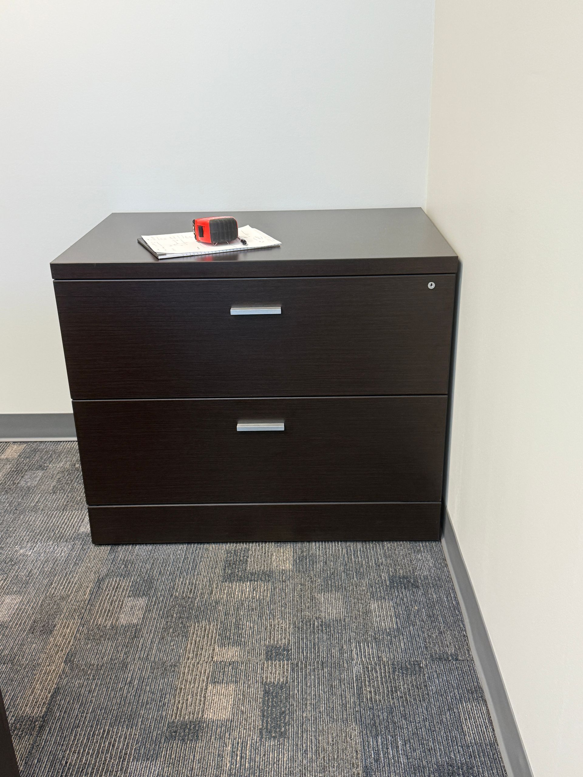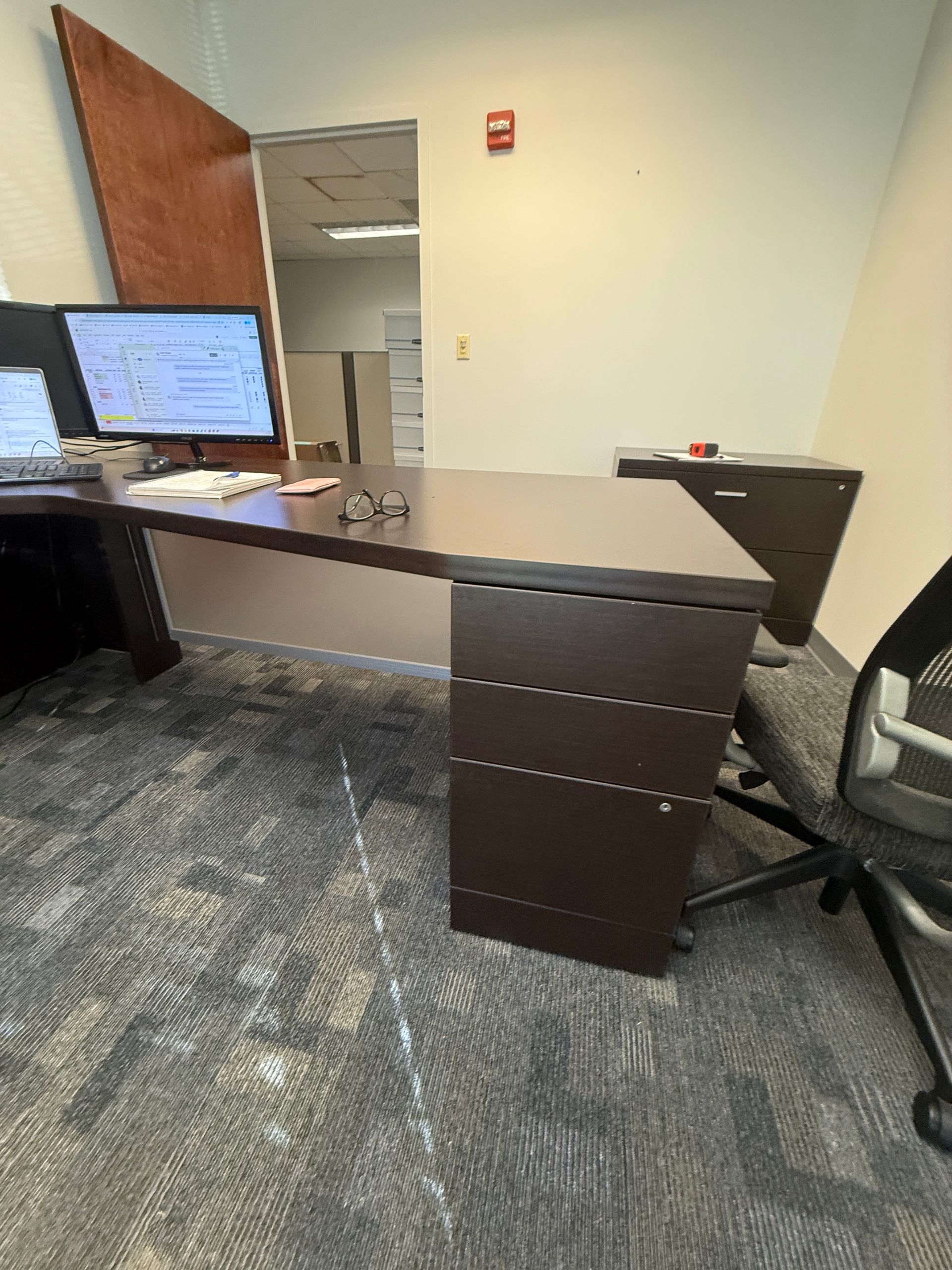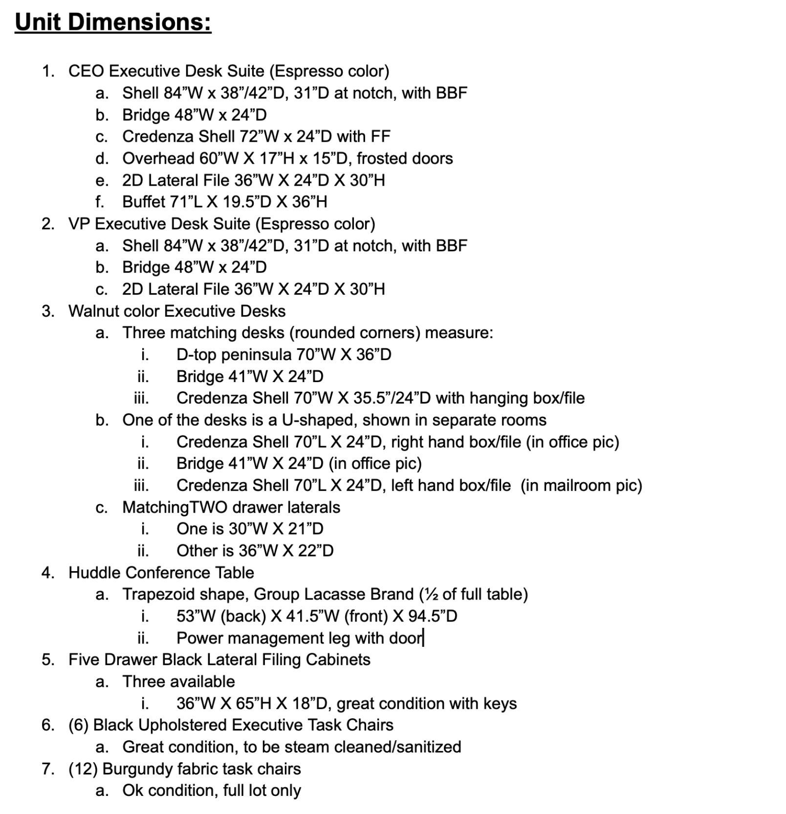 Two espresso color executive sets, espresso color credenza, Four walnut color executive desk sets, five drawer laterals, huddle table, various chairs