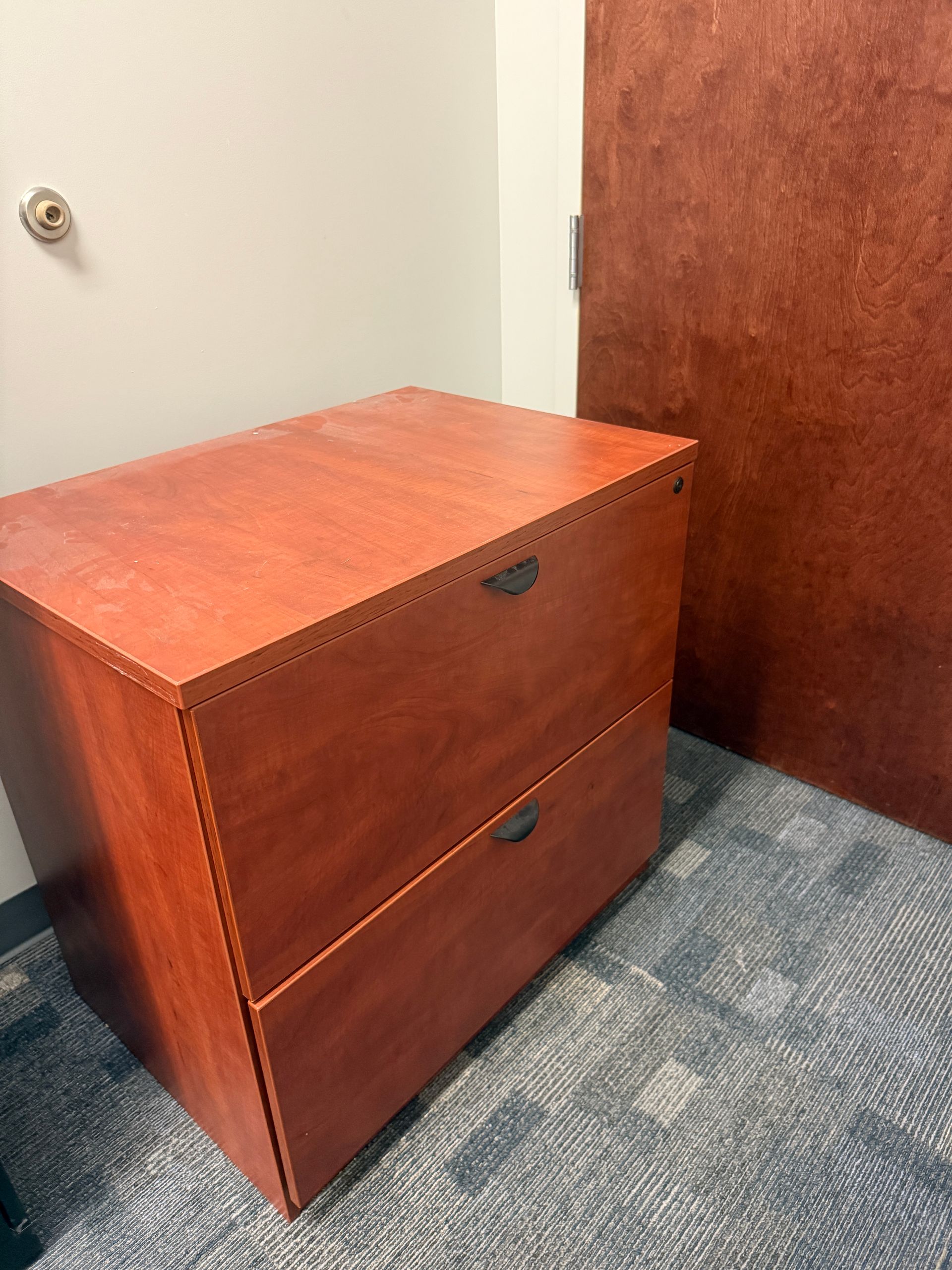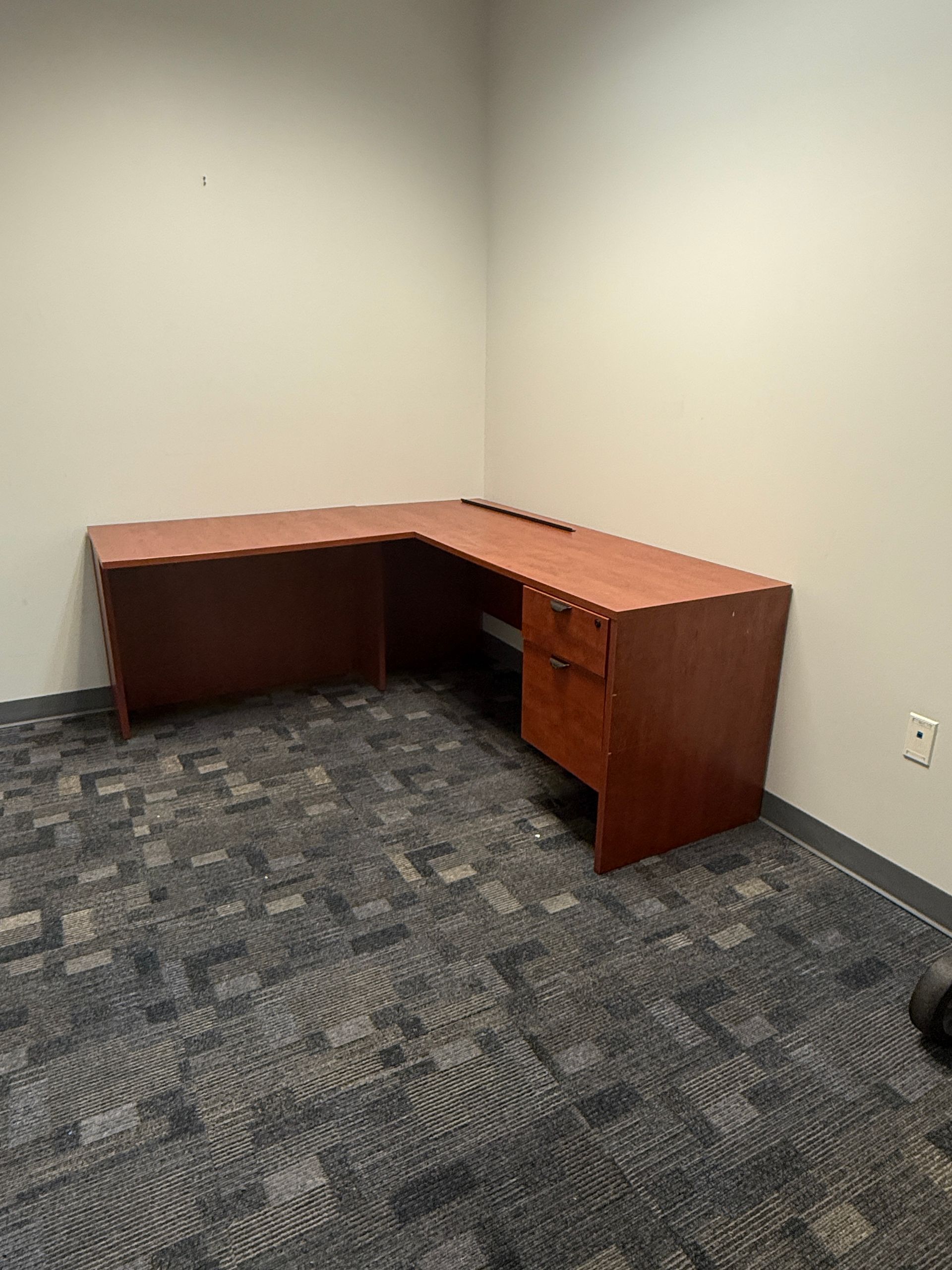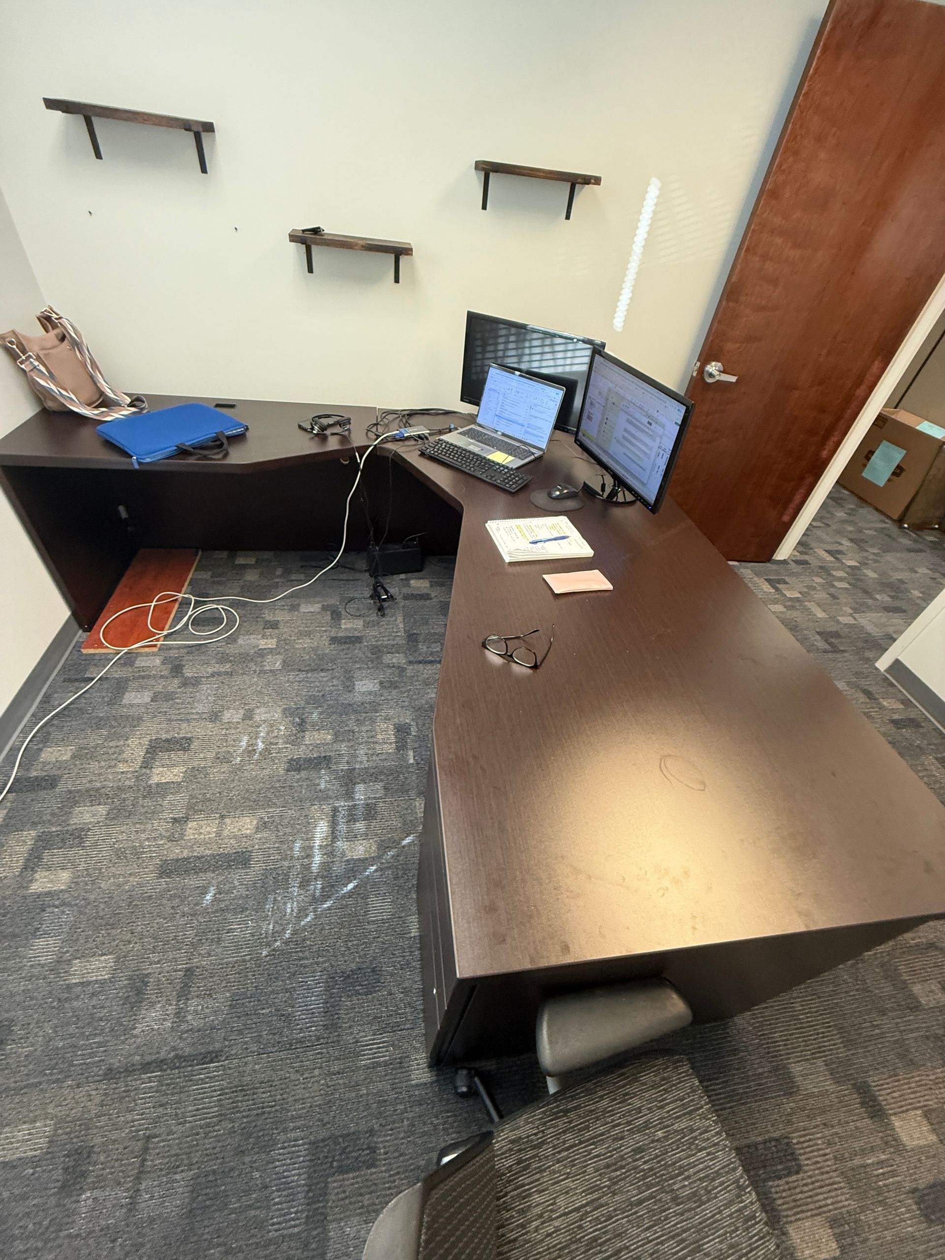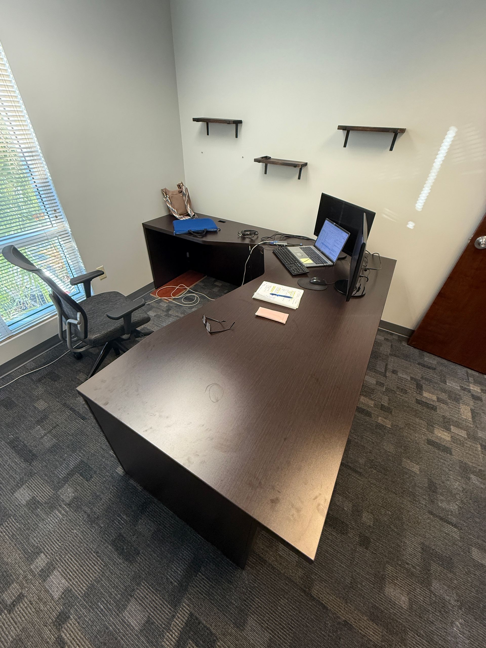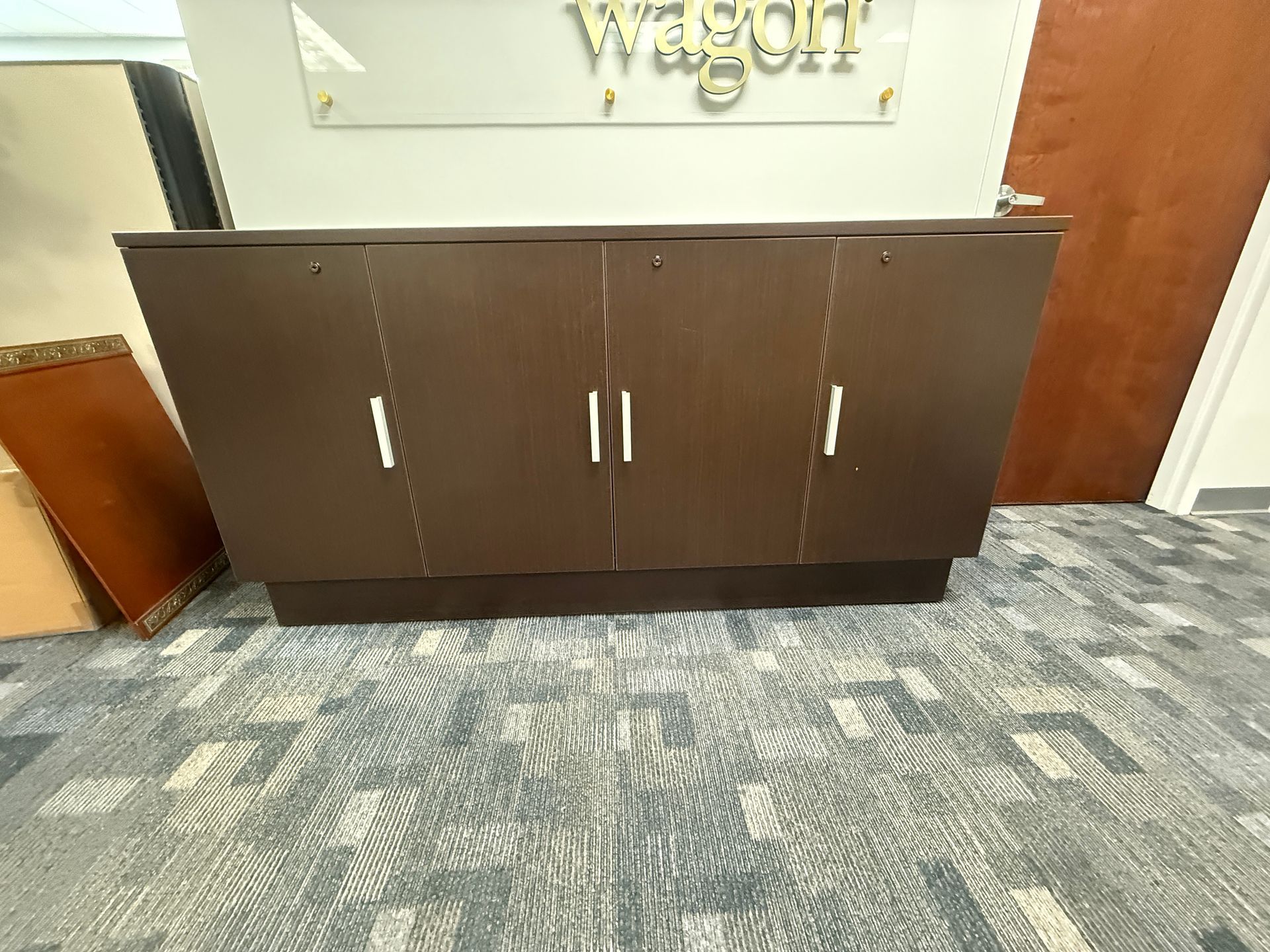 Two espresso color executive sets, espresso color credenza, Four walnut color executive desk sets, five drawer laterals, huddle table, various chairs