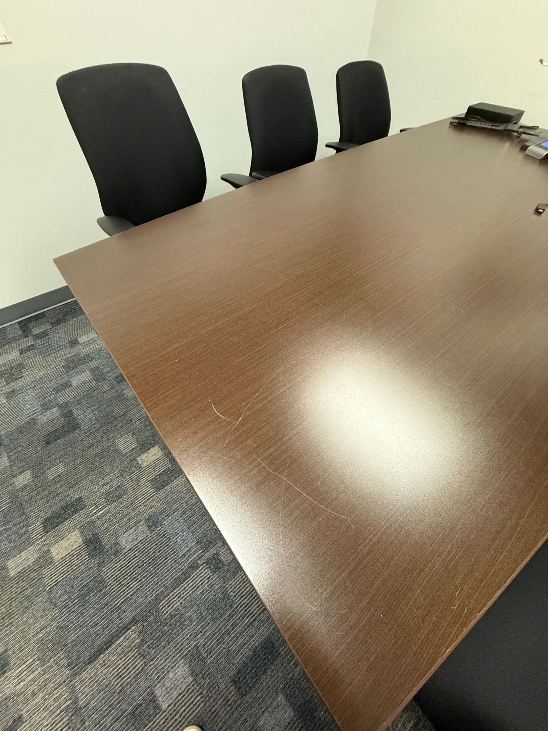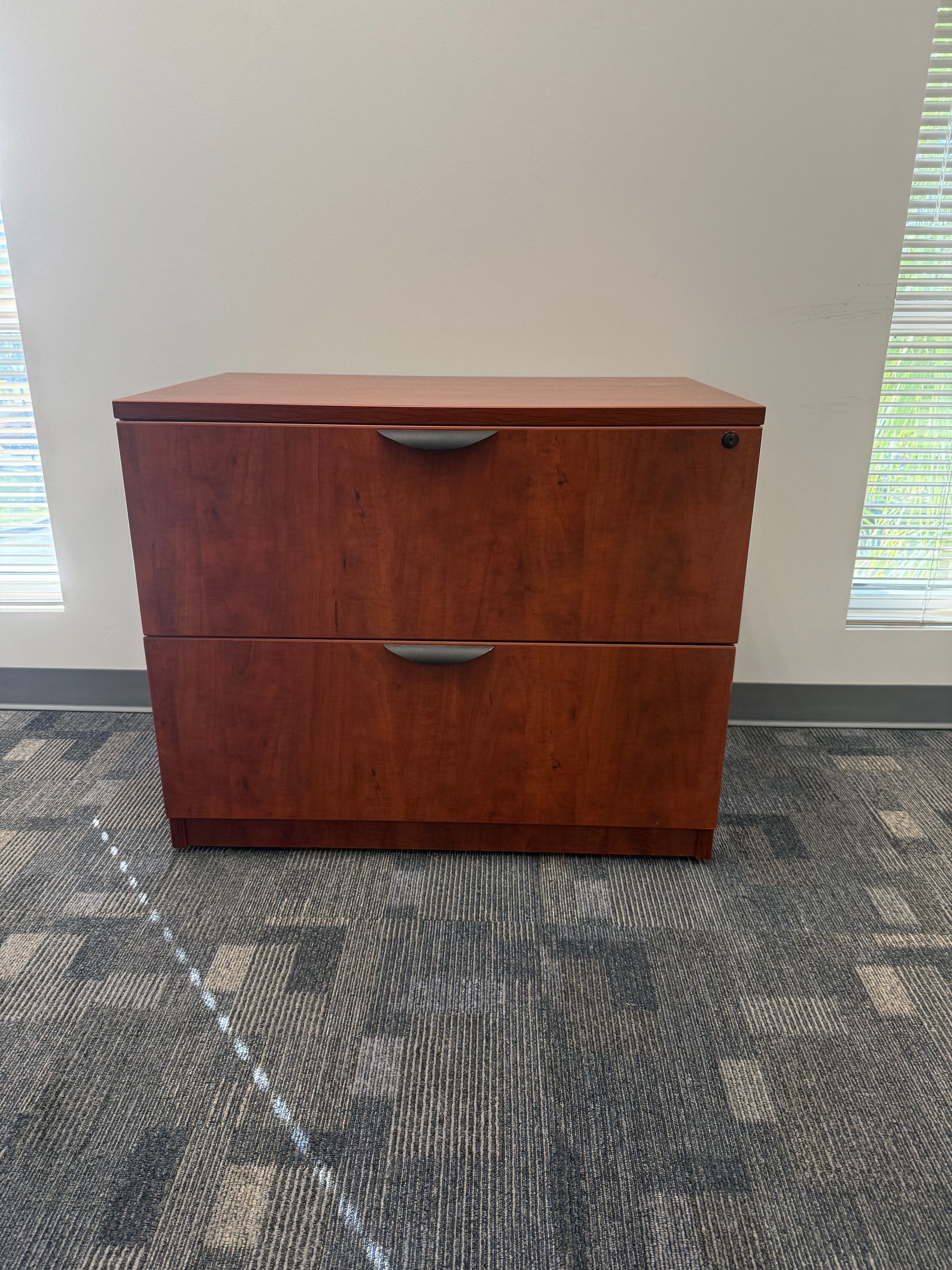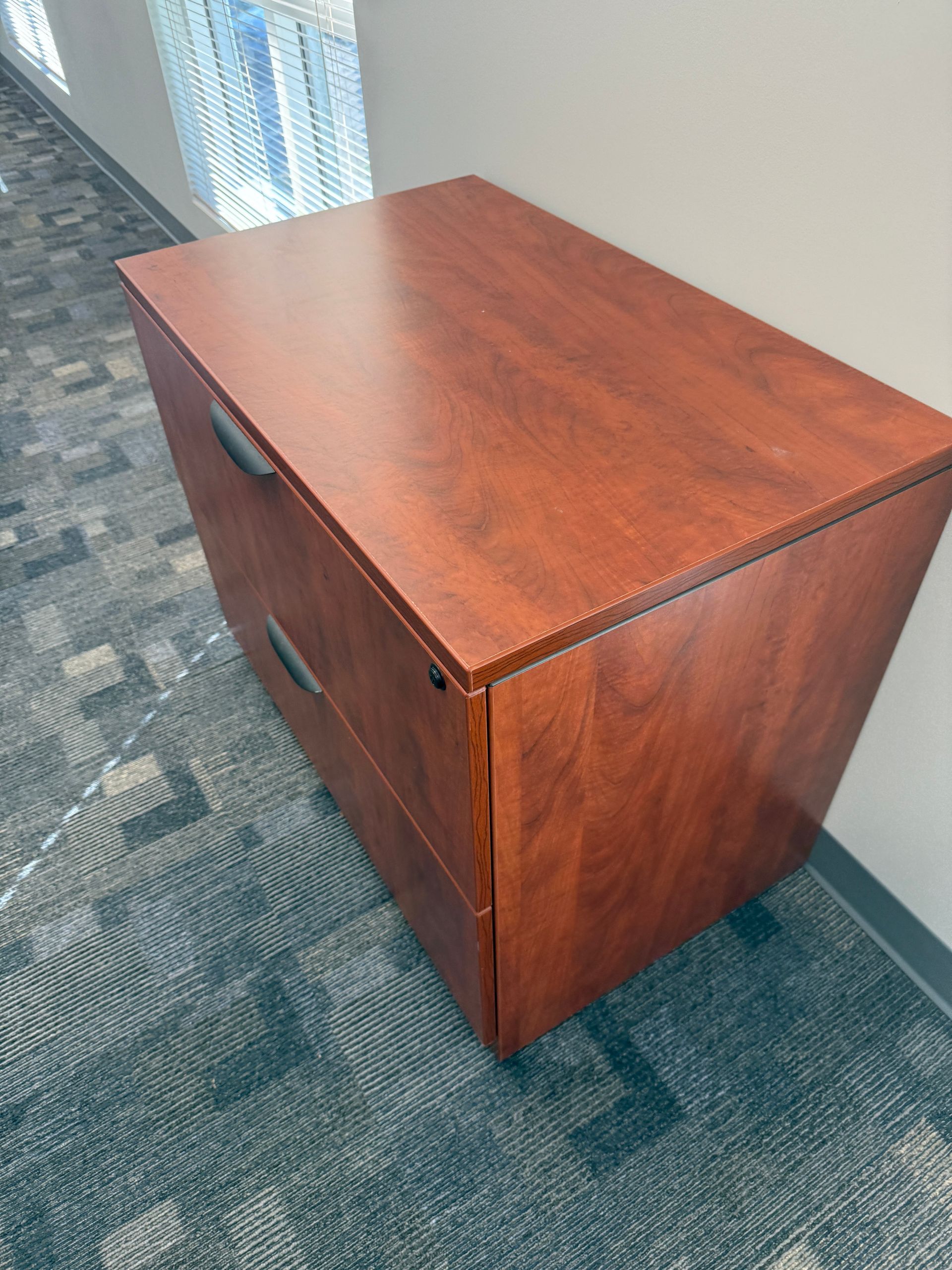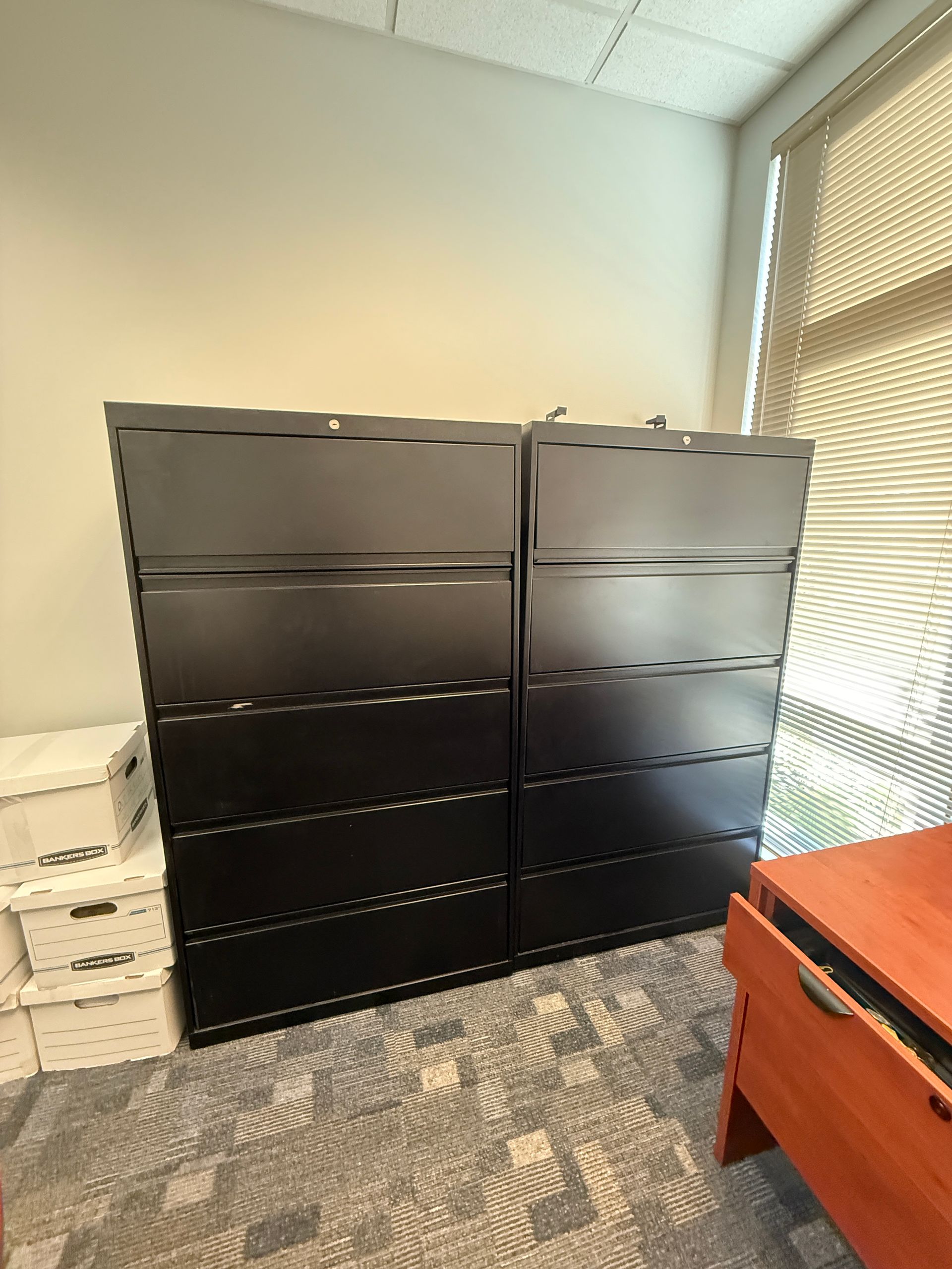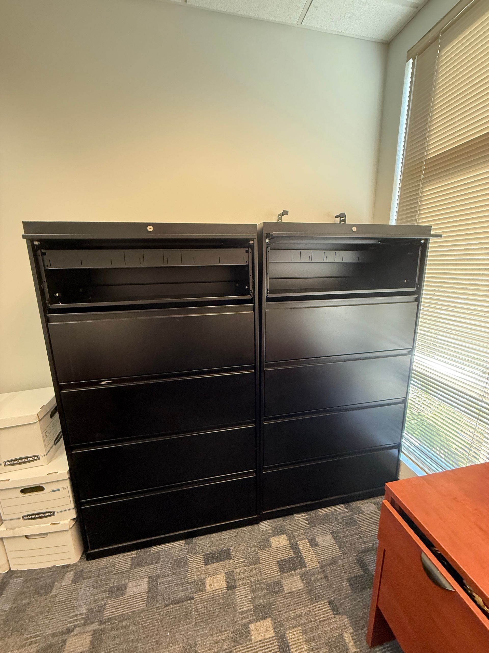 Two espresso color executive sets, espresso color credenza, Four walnut color executive desk sets, five drawer laterals, huddle table, various chairs