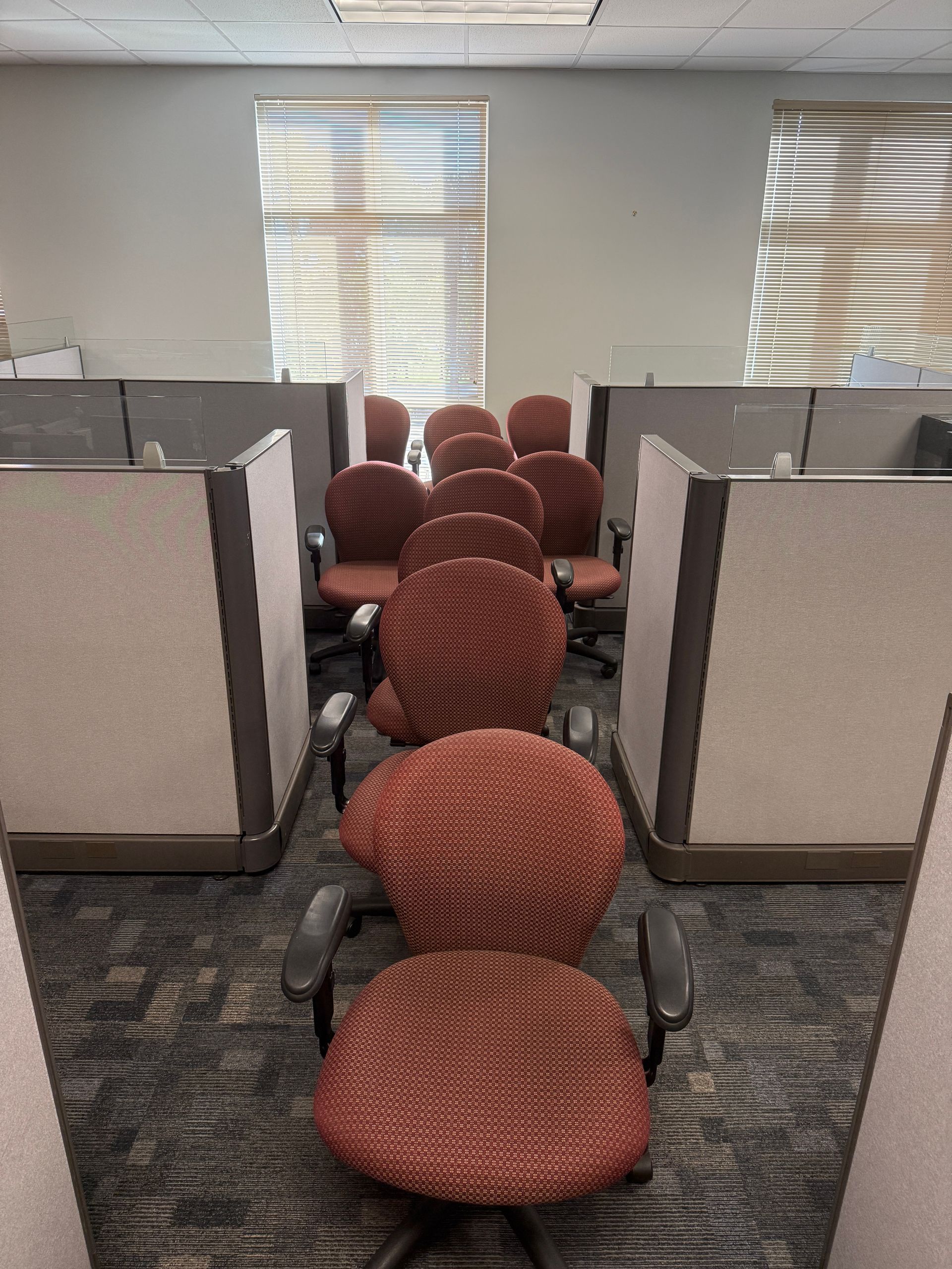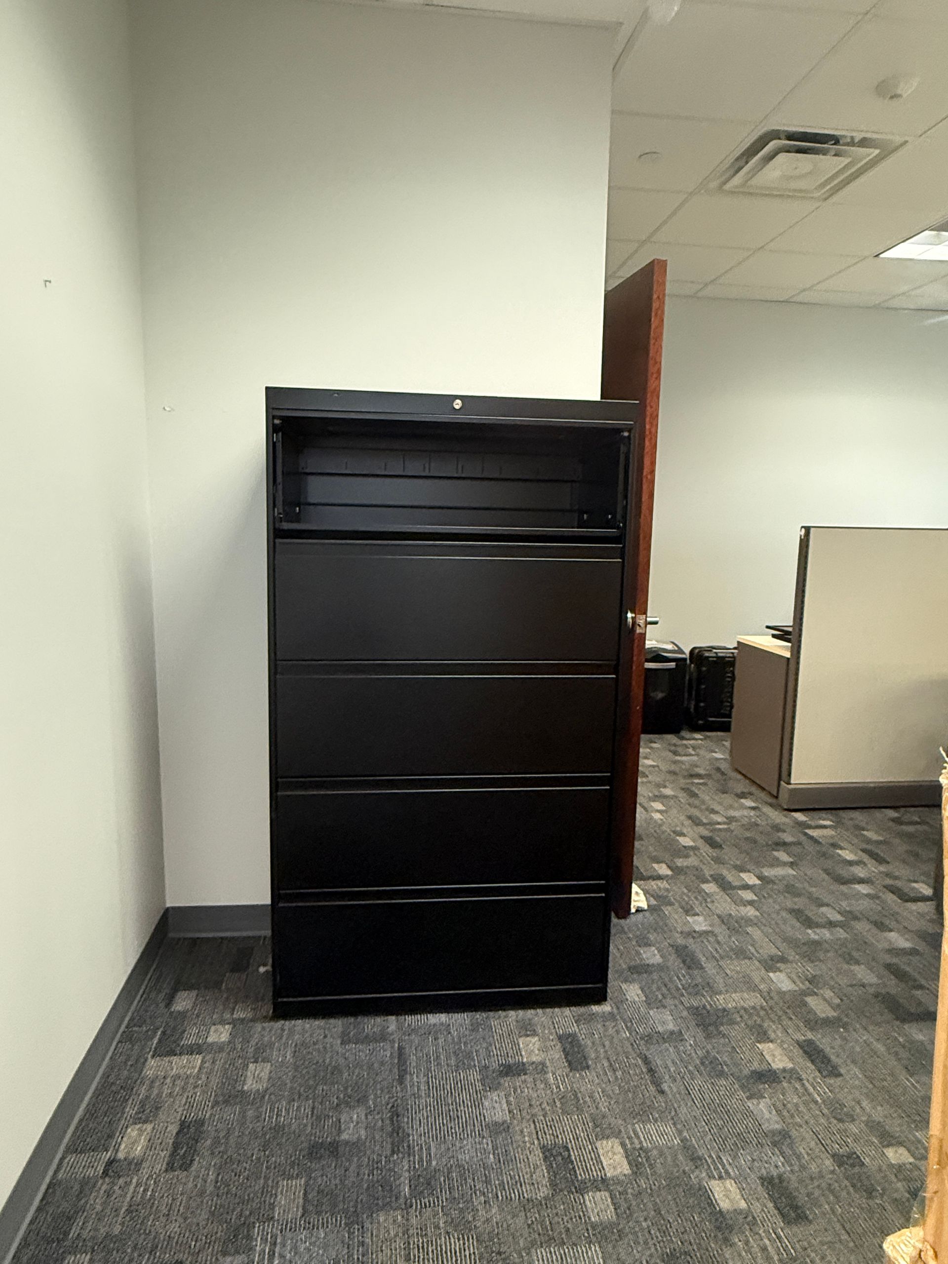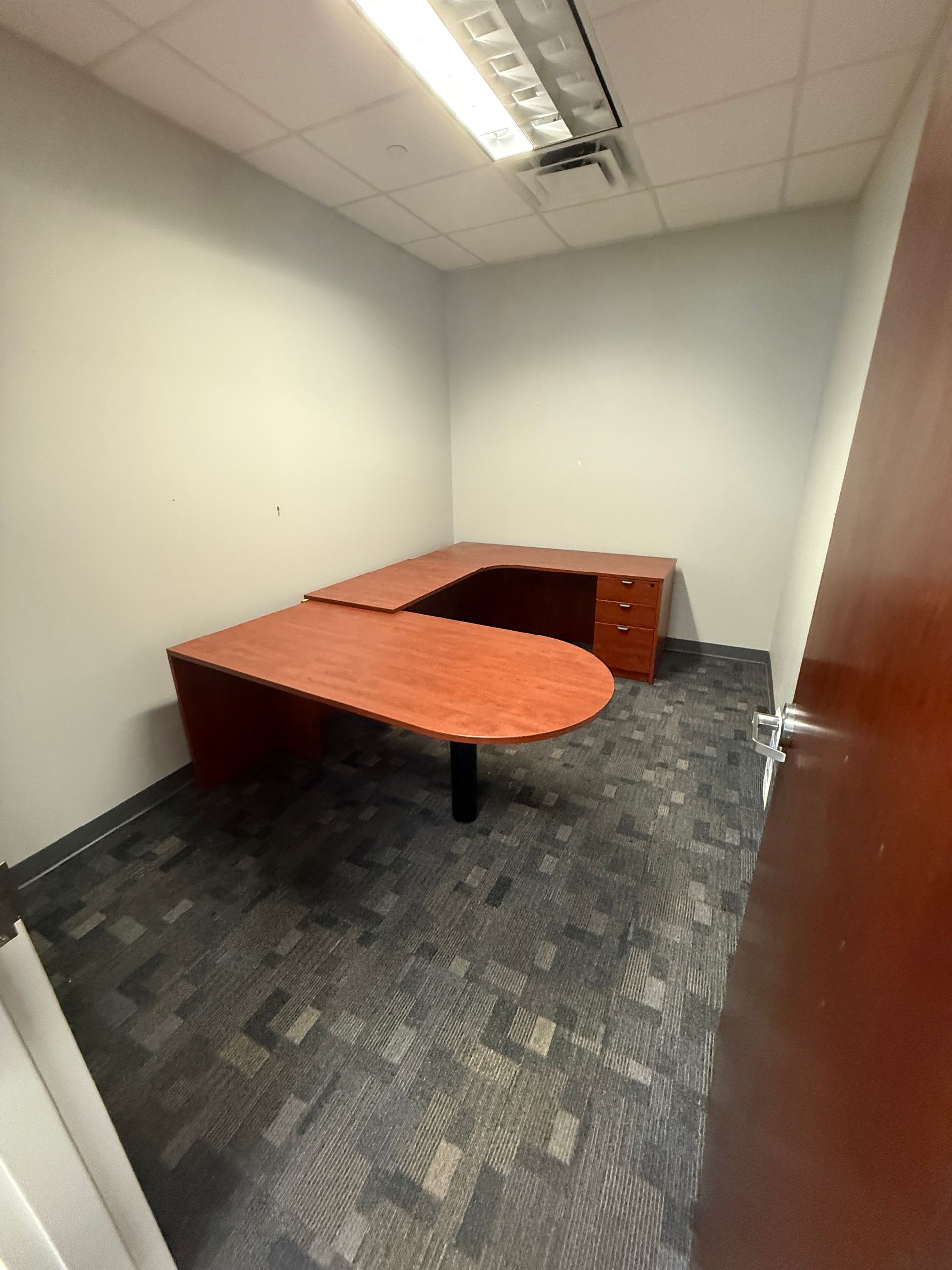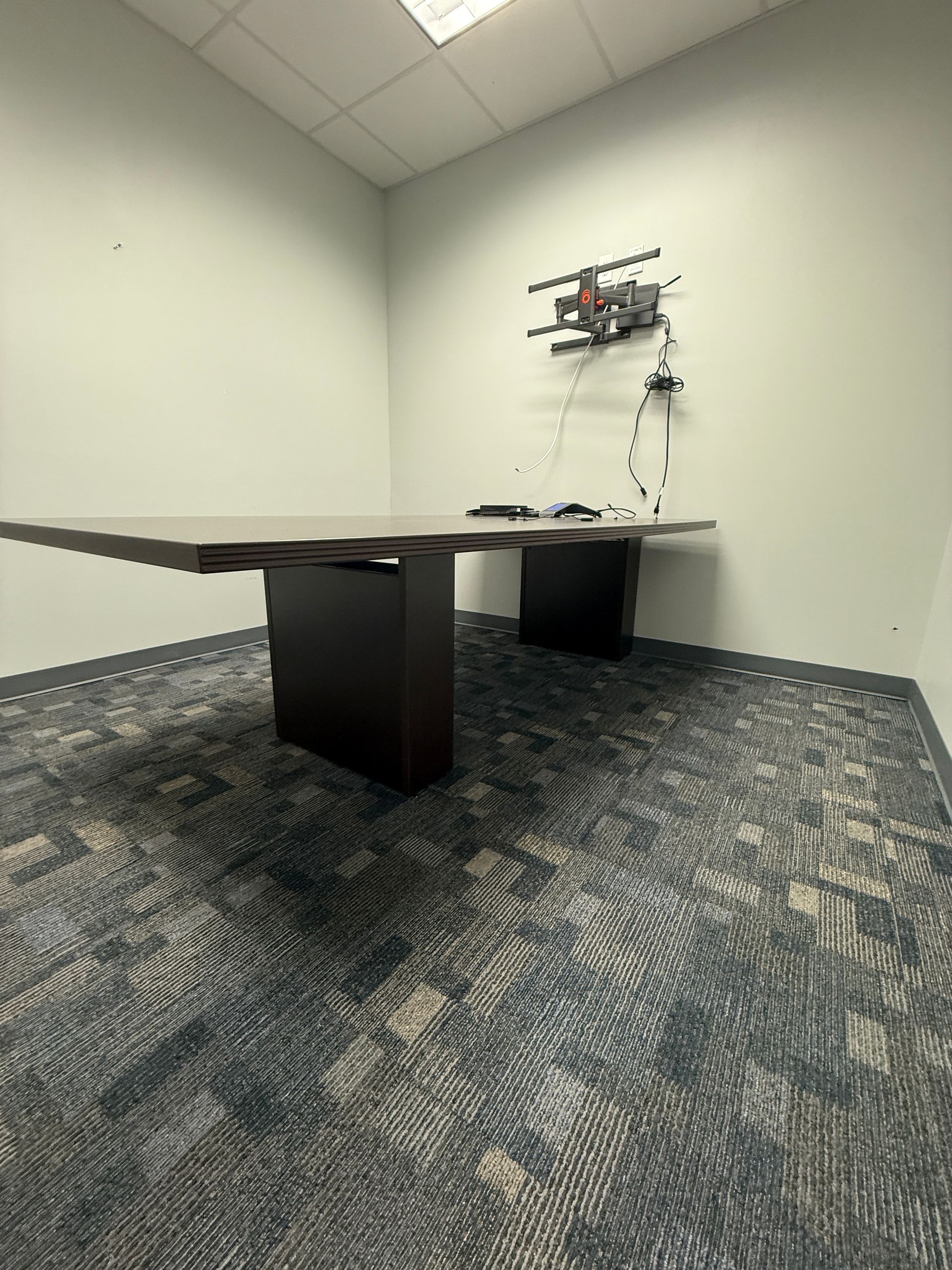 Two espresso color executive sets, espresso color credenza, Four walnut color executive desk sets, five drawer laterals, huddle table, various chairs