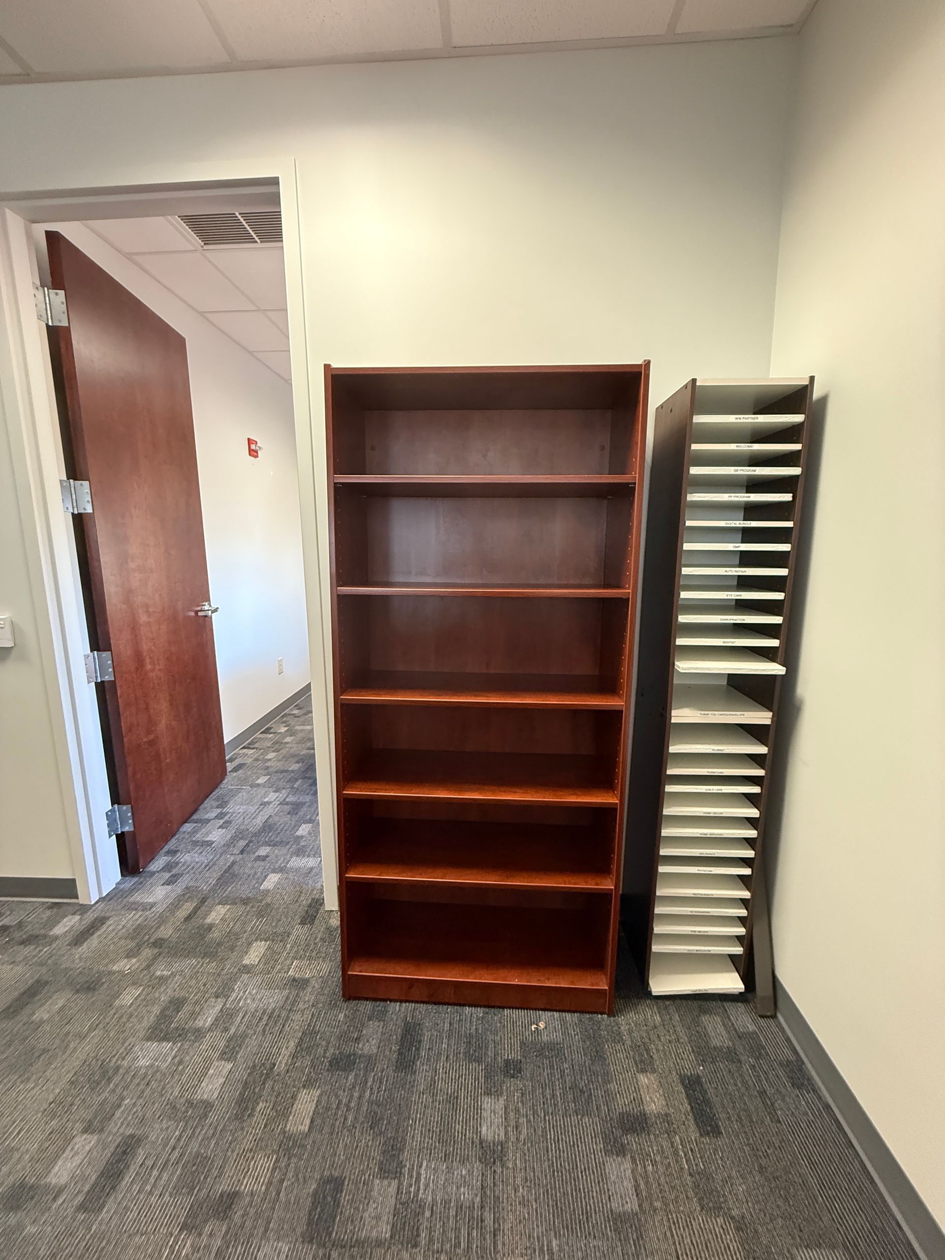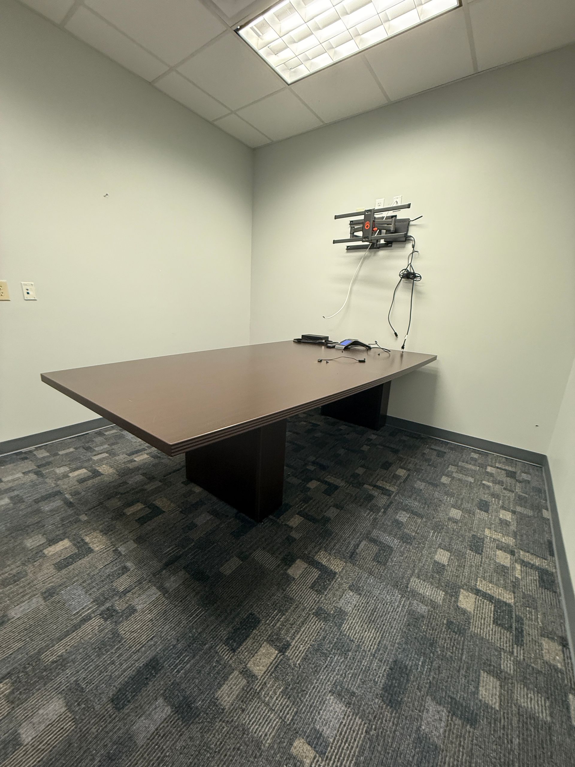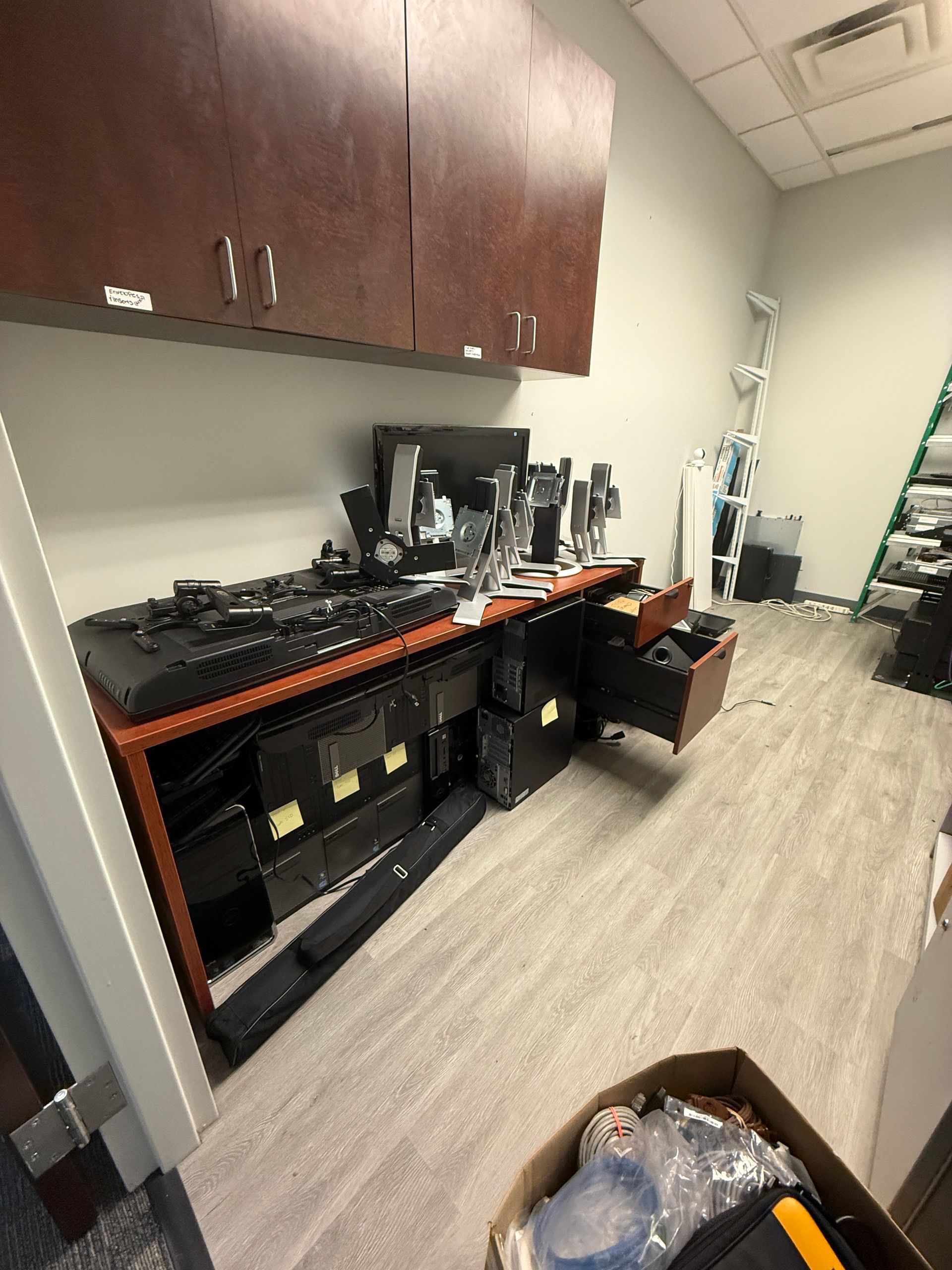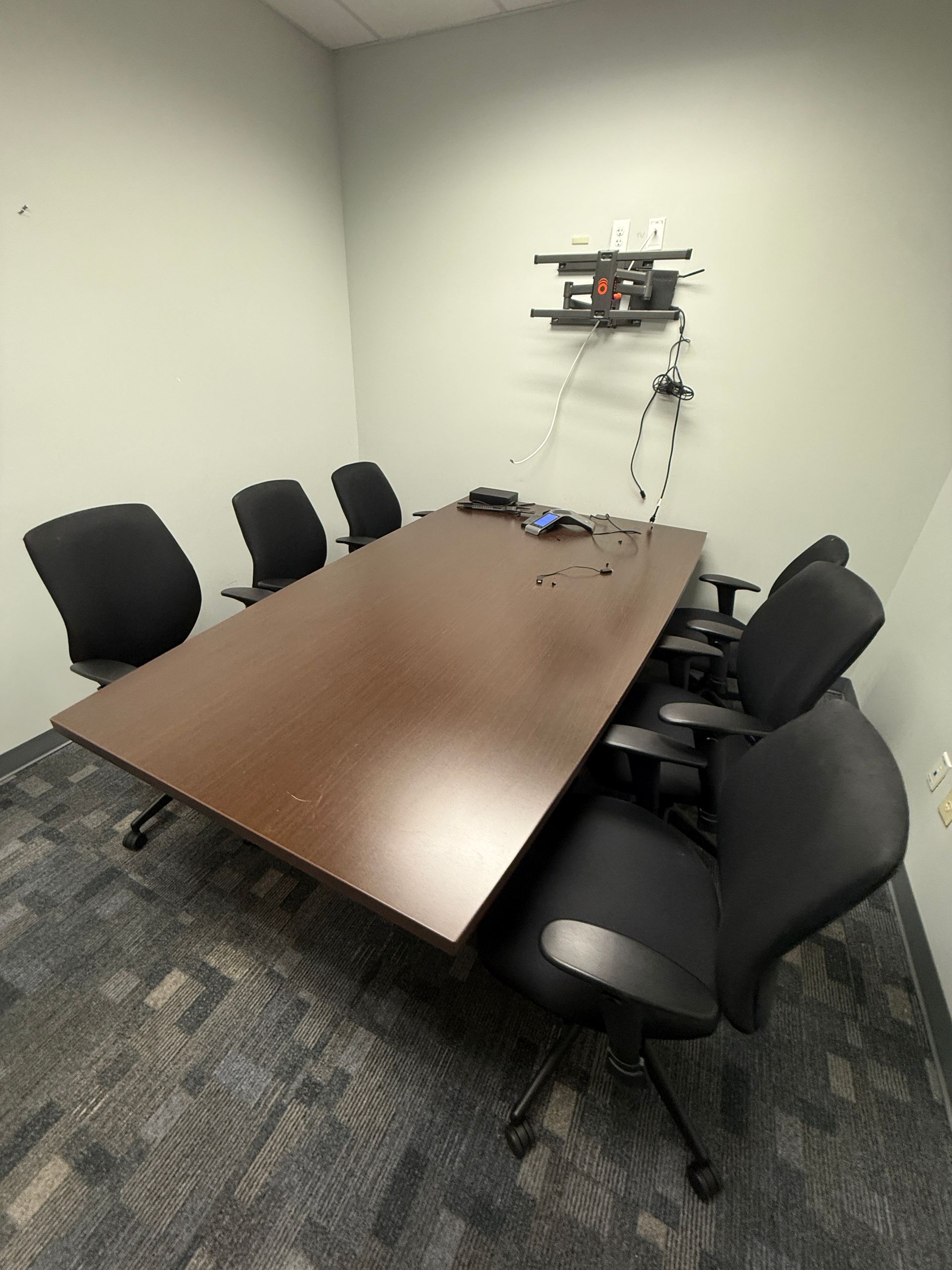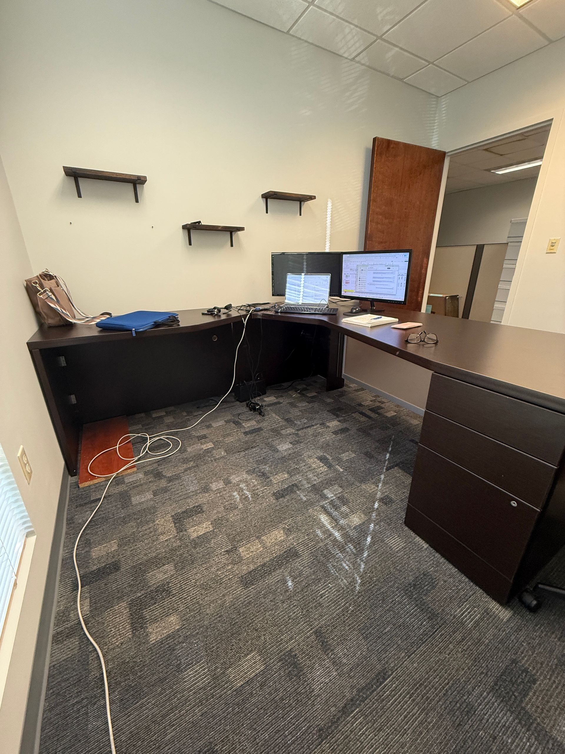 Two espresso color executive sets, espresso color credenza, Four walnut color executive desk sets, five drawer laterals, huddle table, various chairs