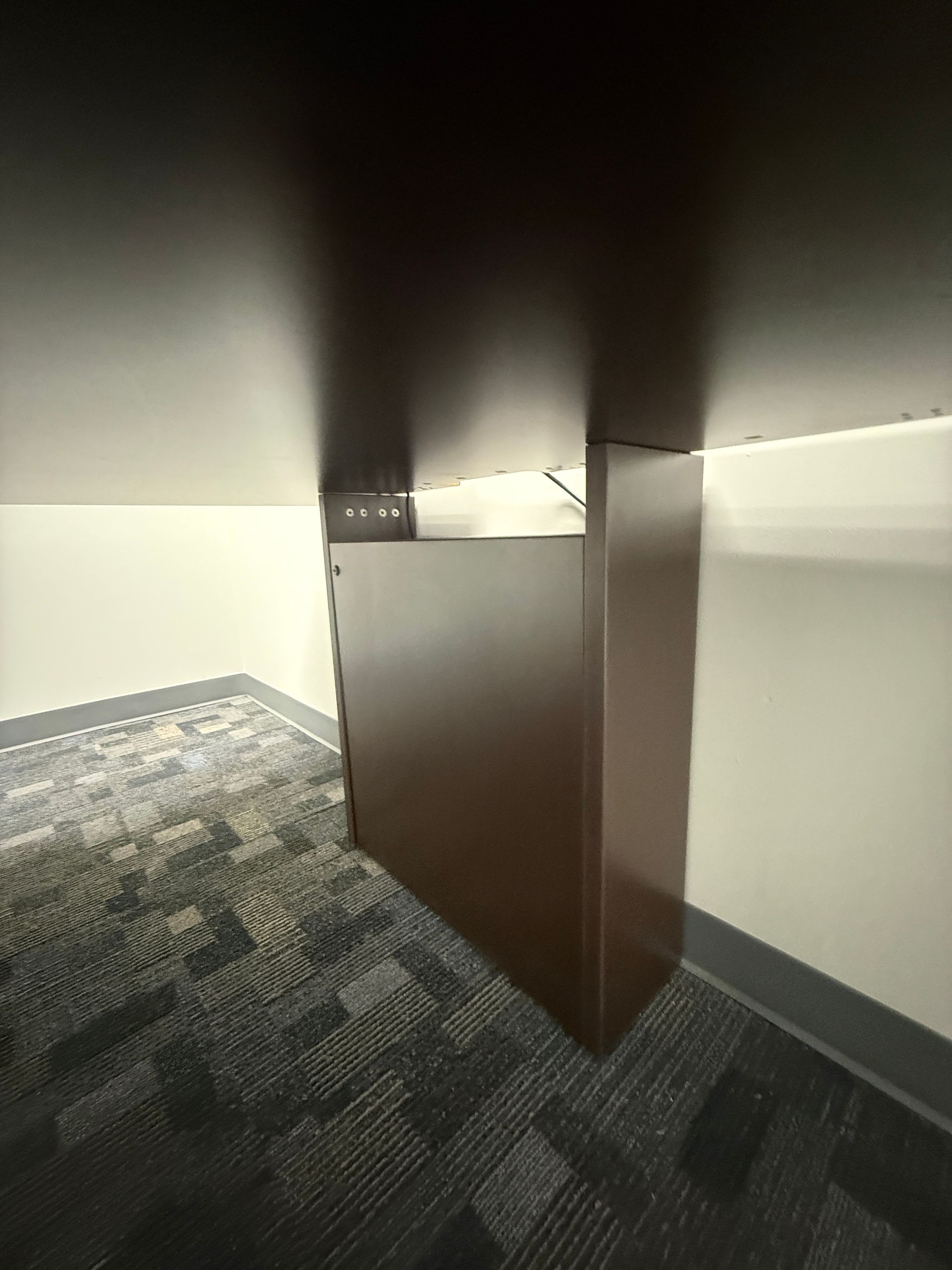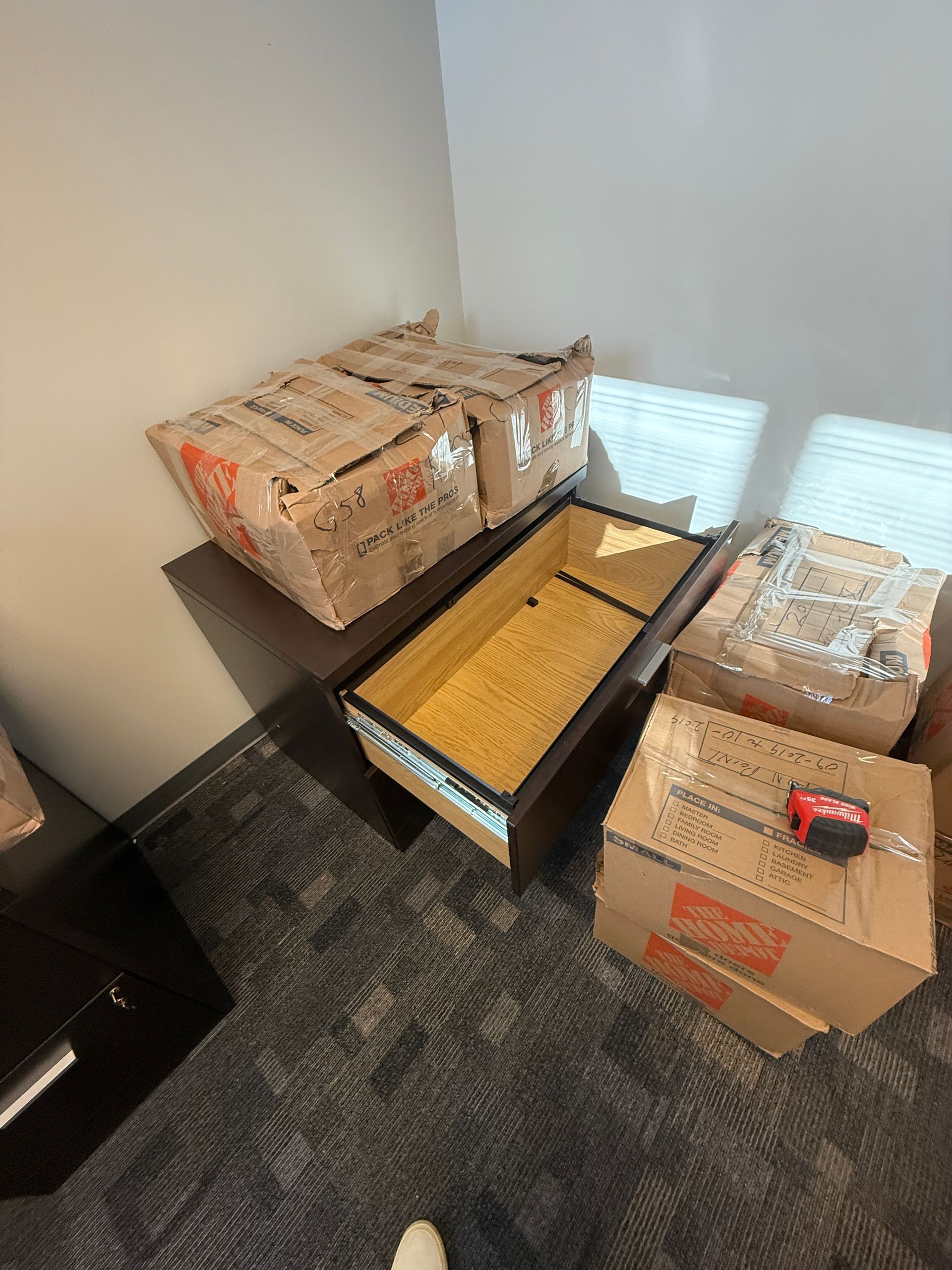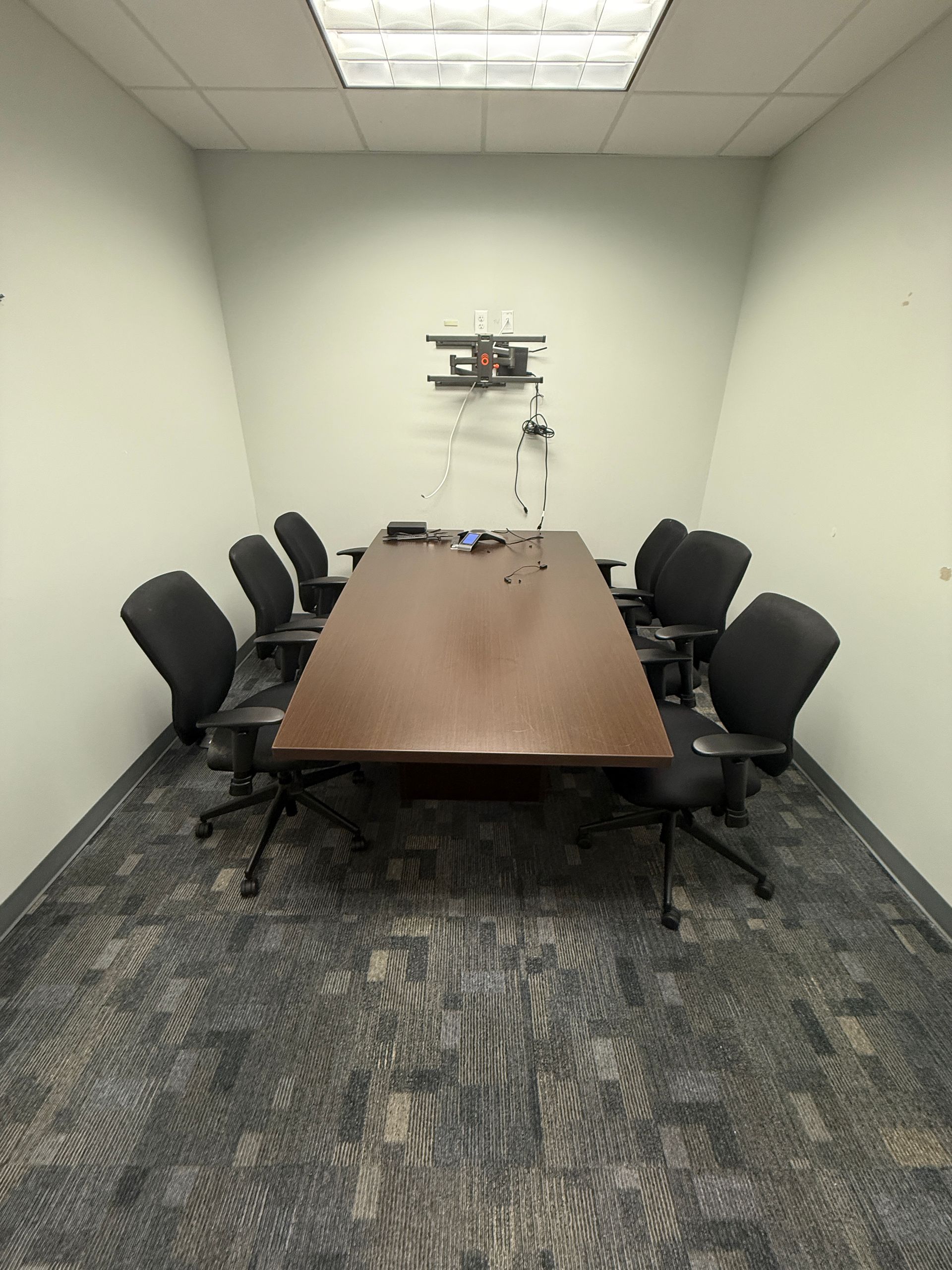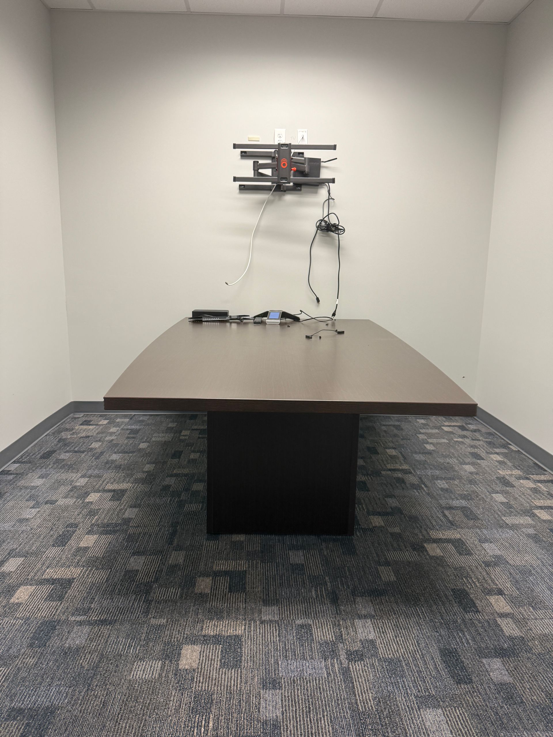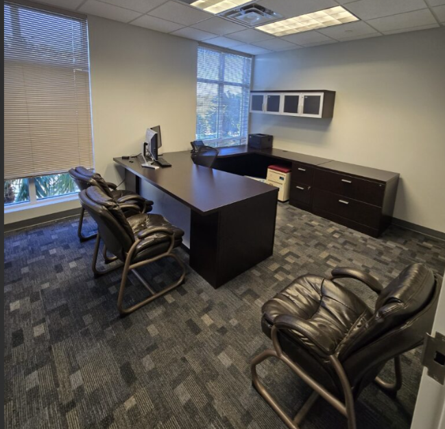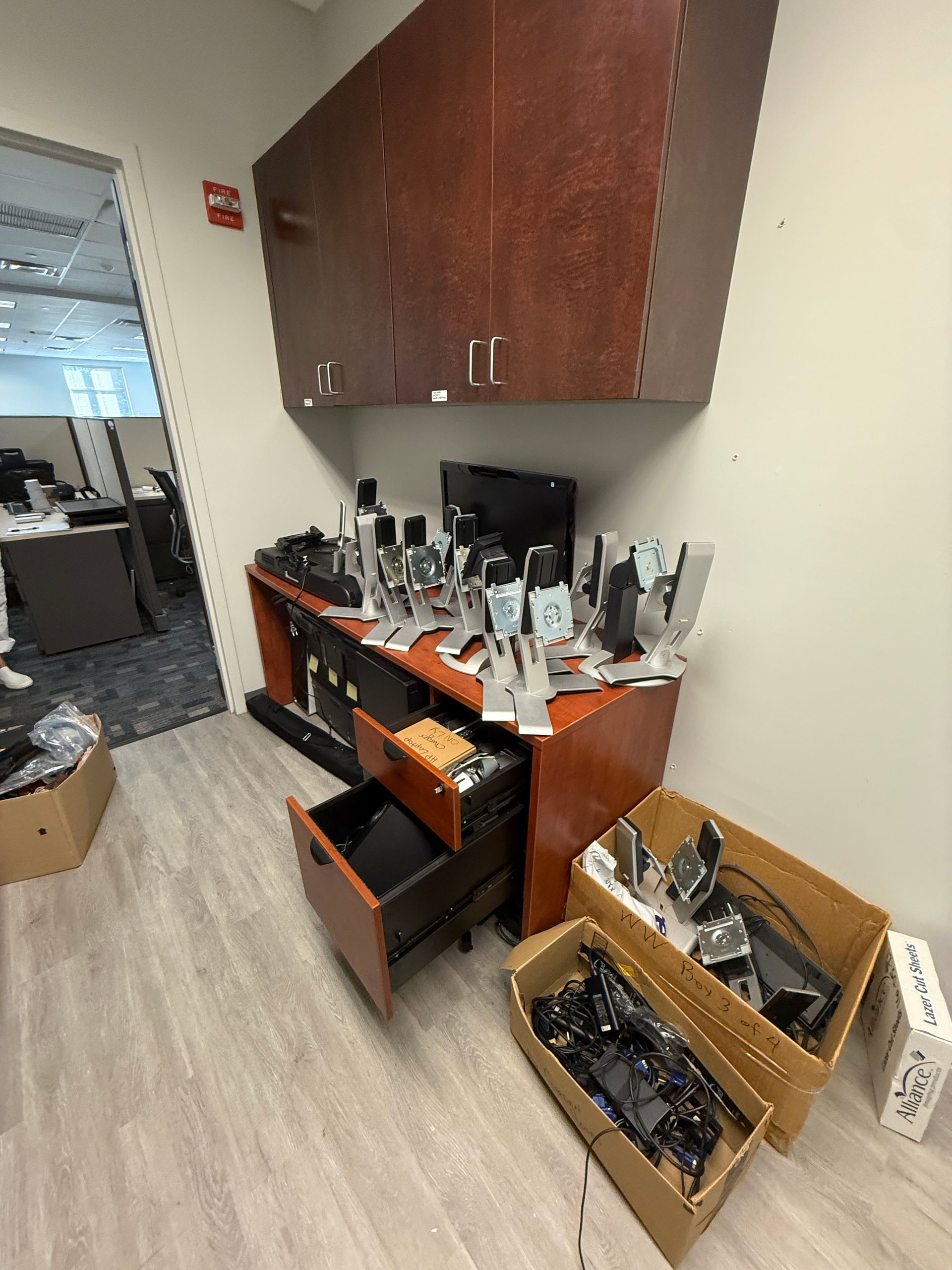 Two espresso color executive sets, espresso color credenza, Four walnut color executive desk sets, five drawer laterals, huddle table, various chairs