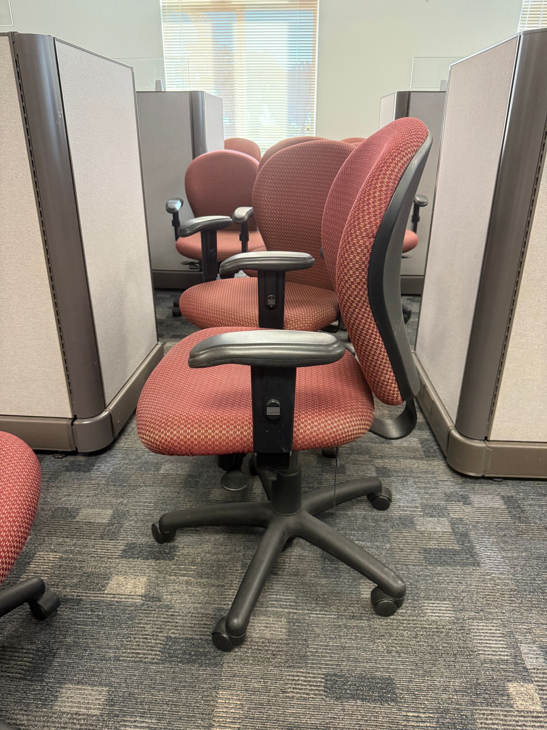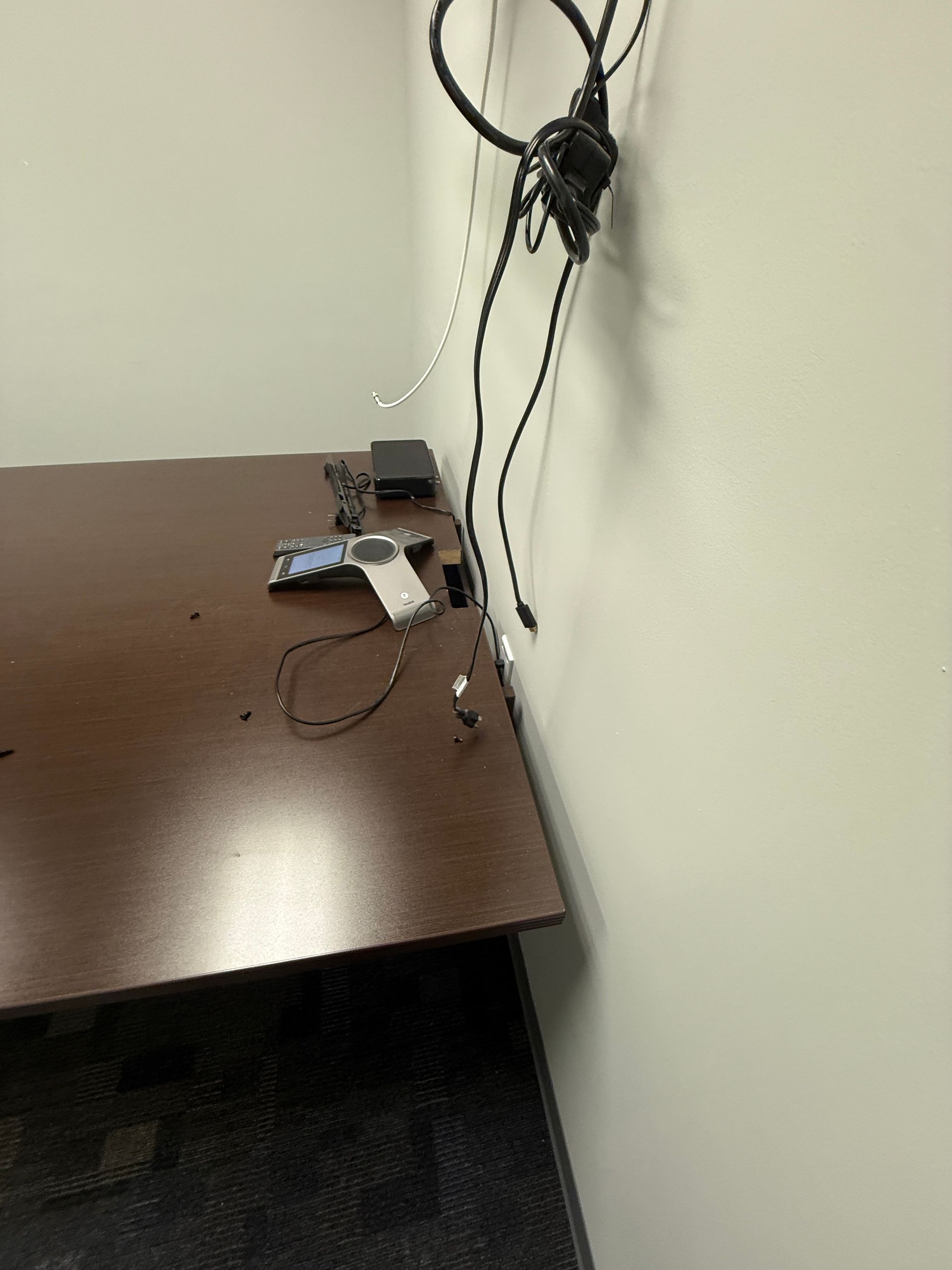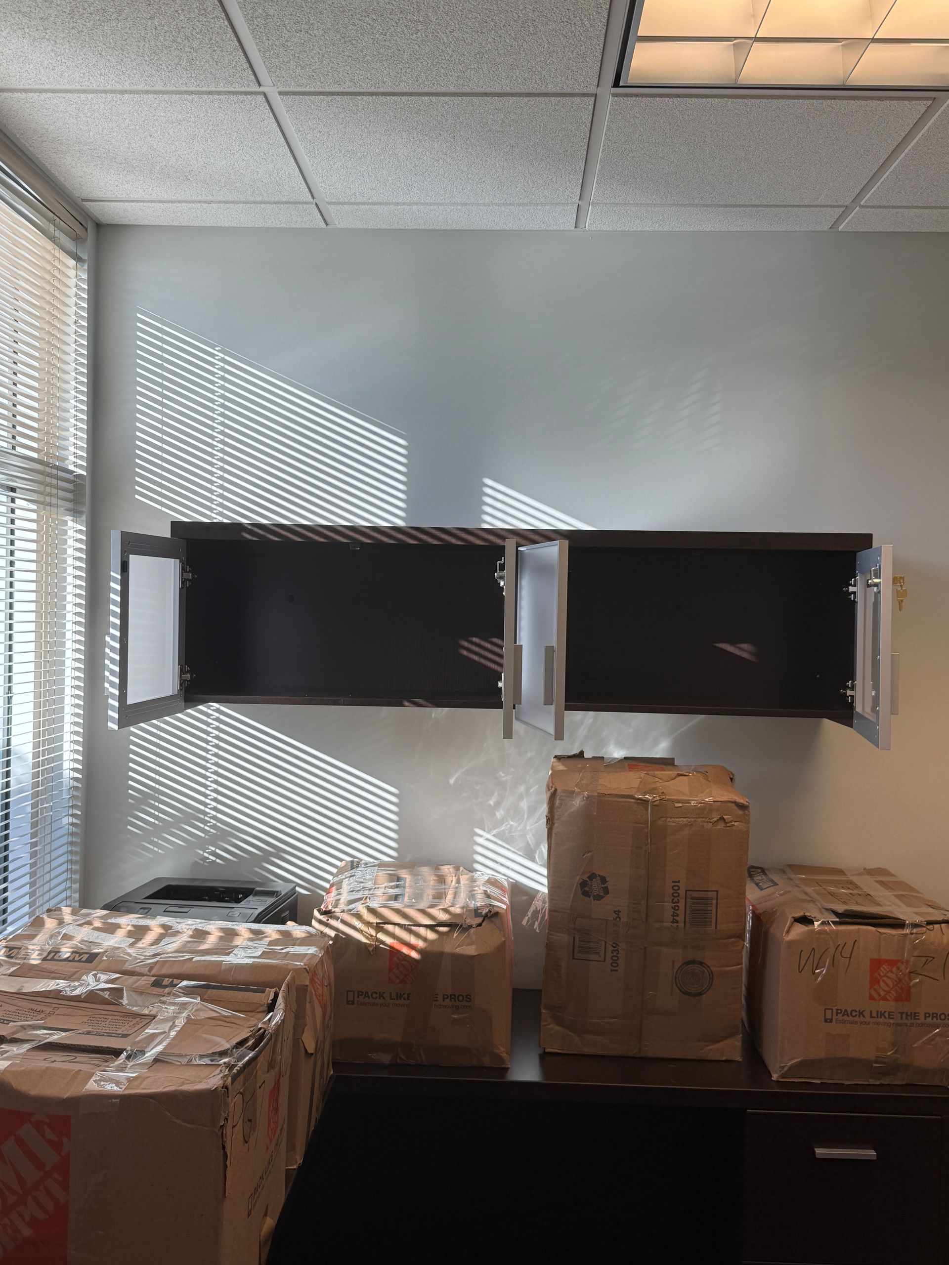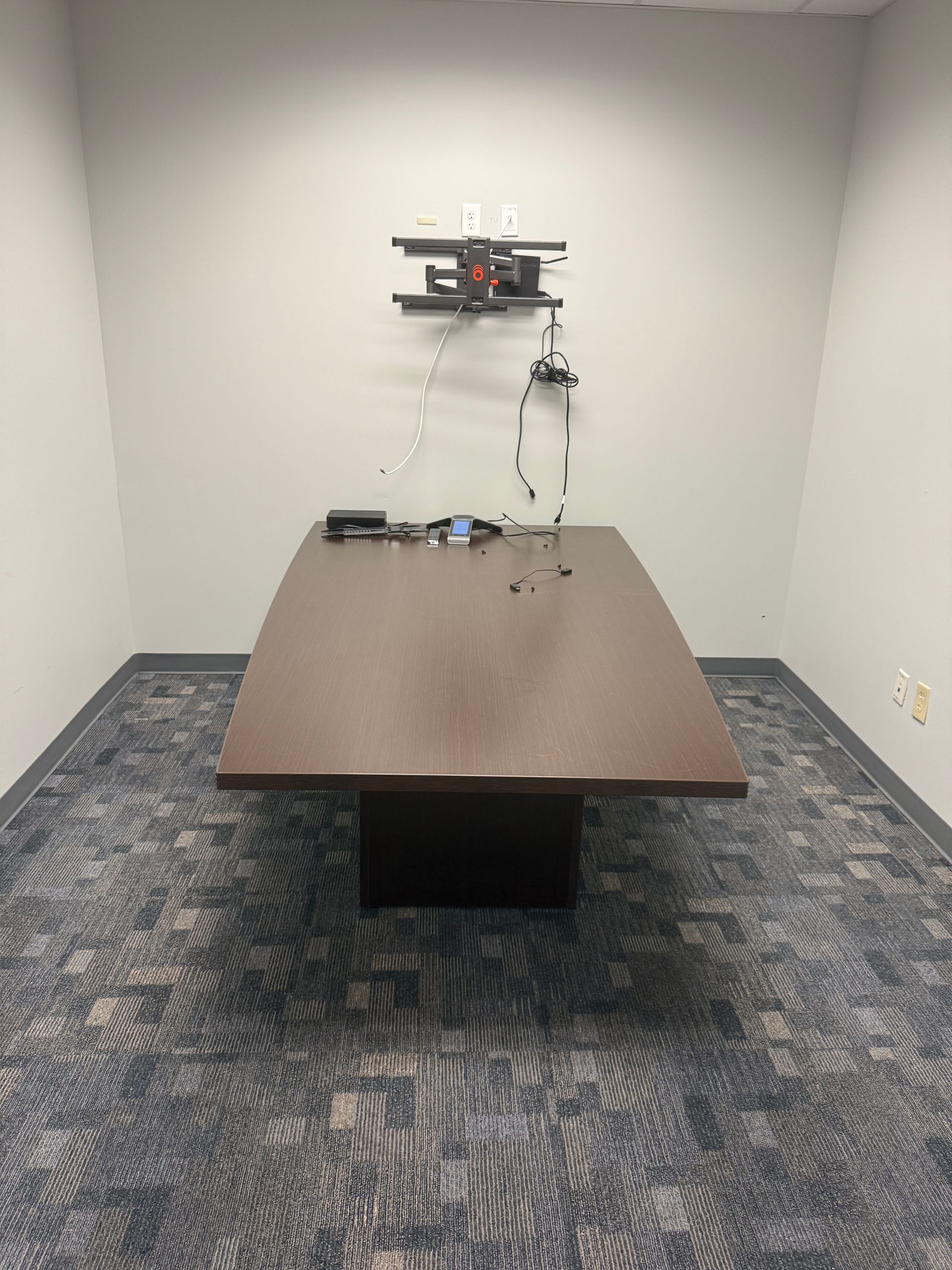 Two espresso color executive sets, espresso color credenza, Four walnut color executive desk sets, five drawer laterals, huddle table, various chairs