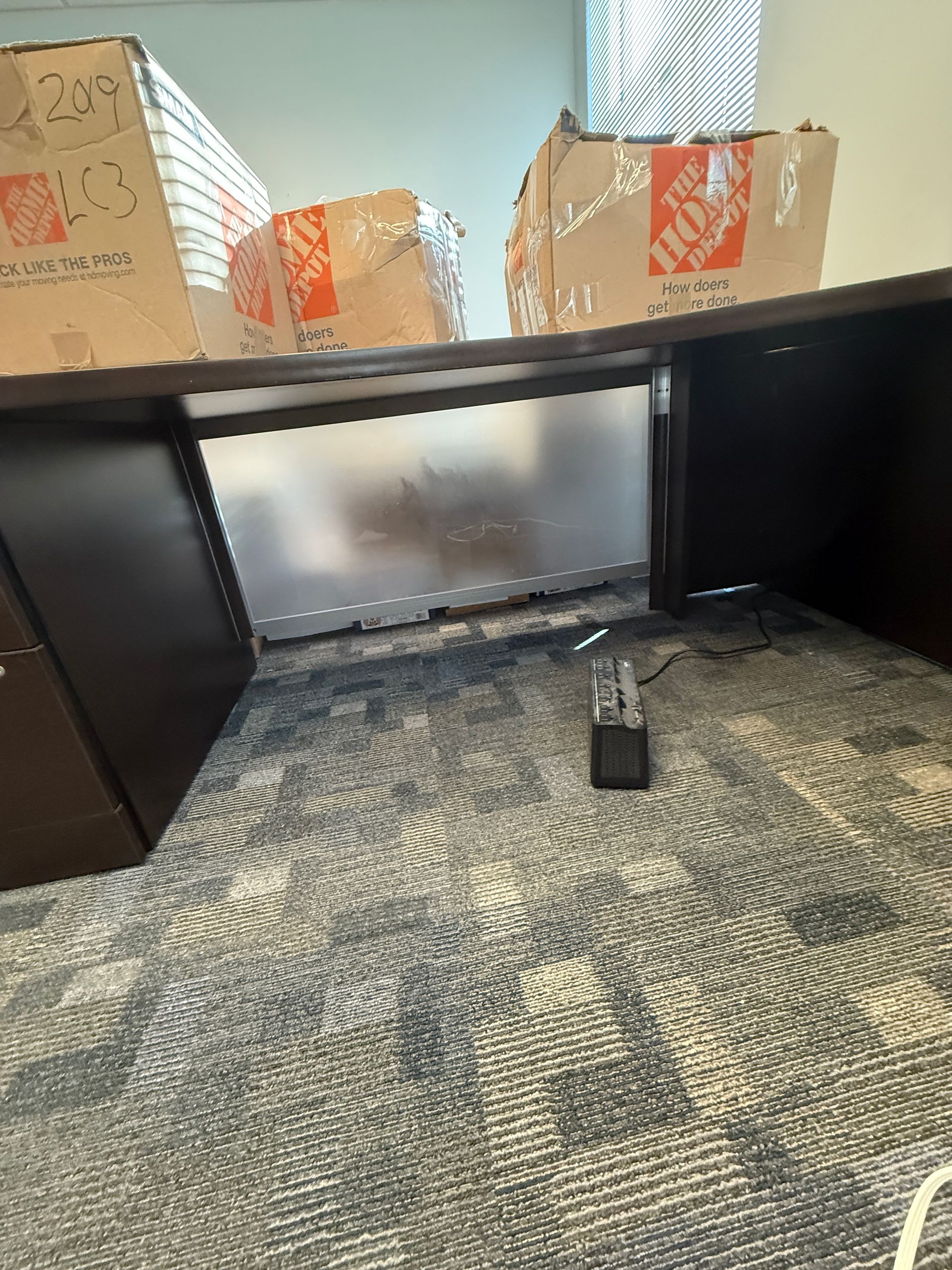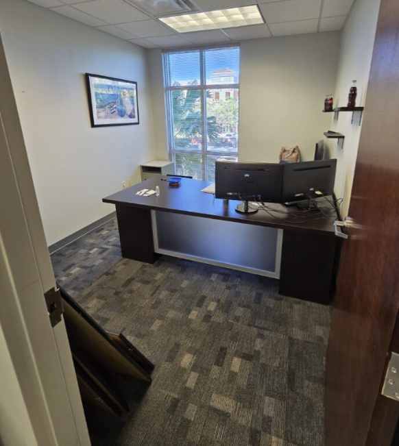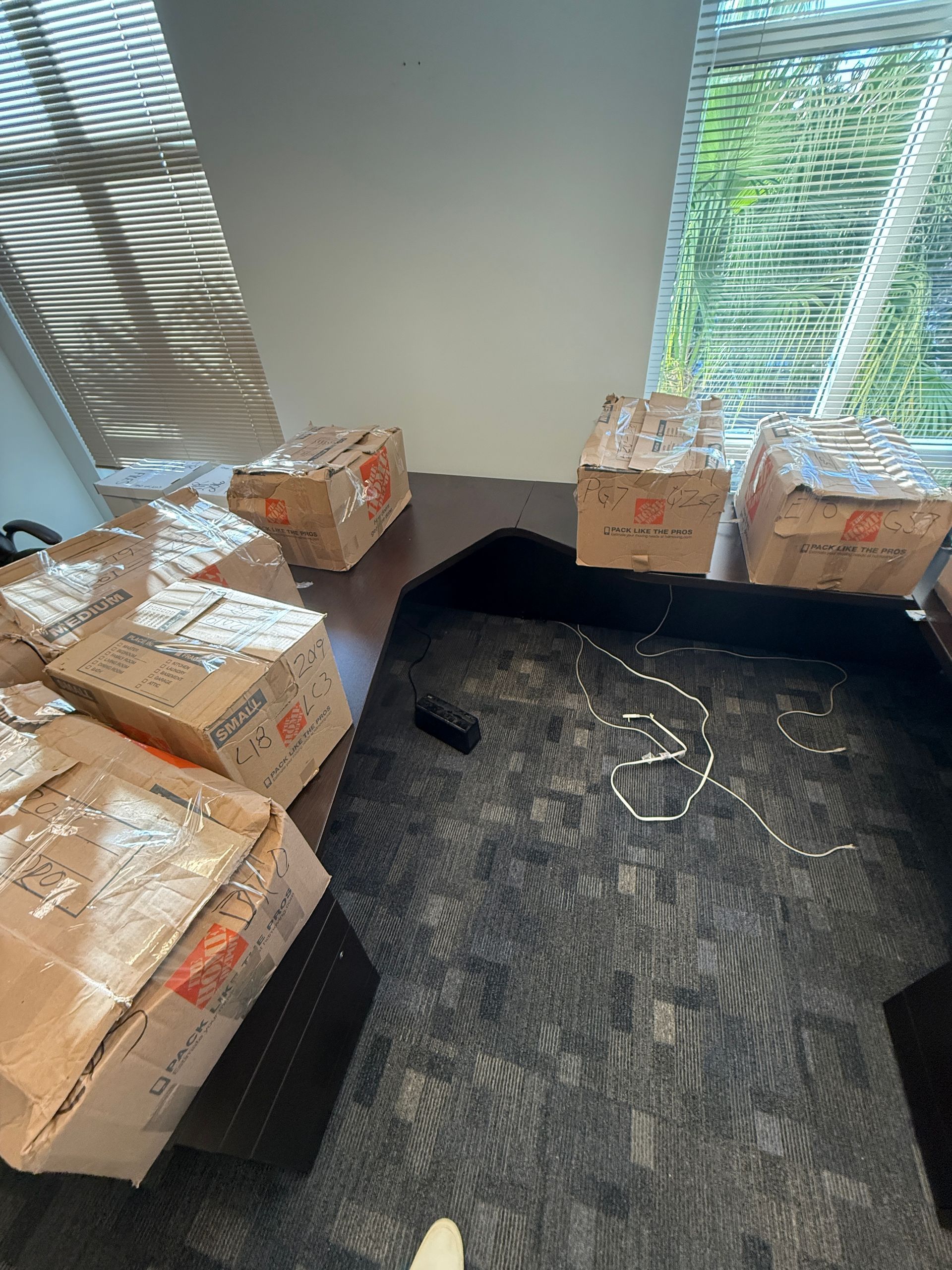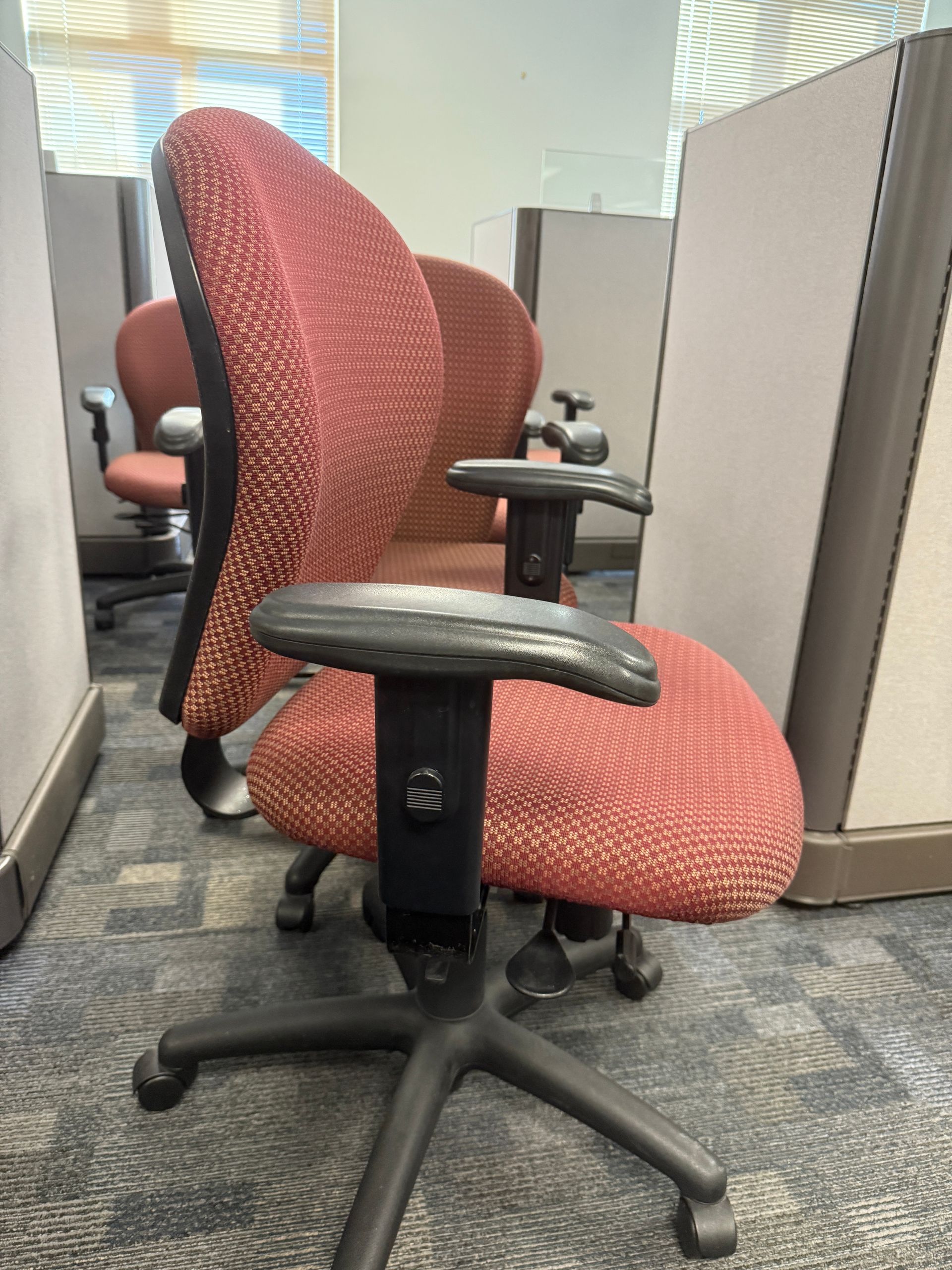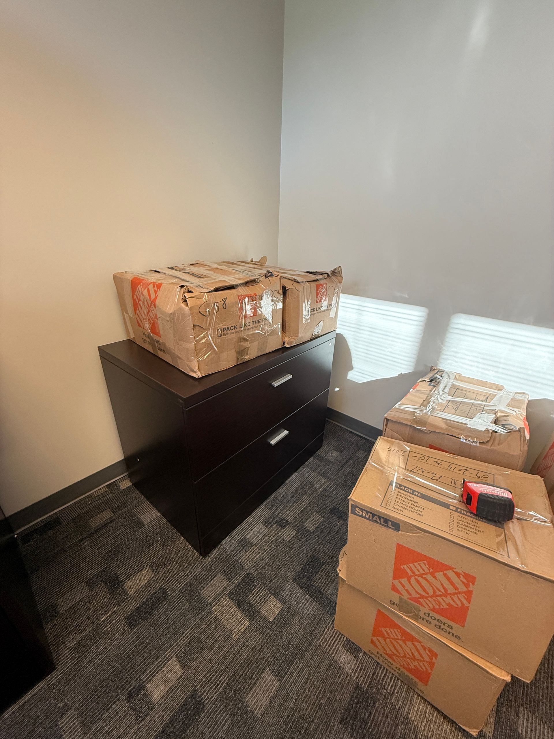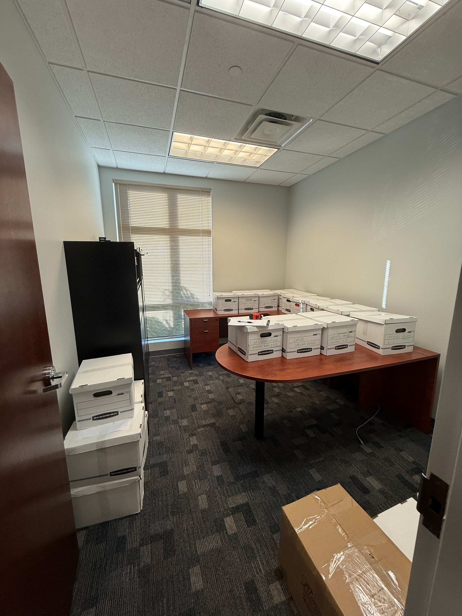 Two espresso color executive sets, espresso color credenza, Four walnut color executive desk sets, five drawer laterals, huddle table, various chairs