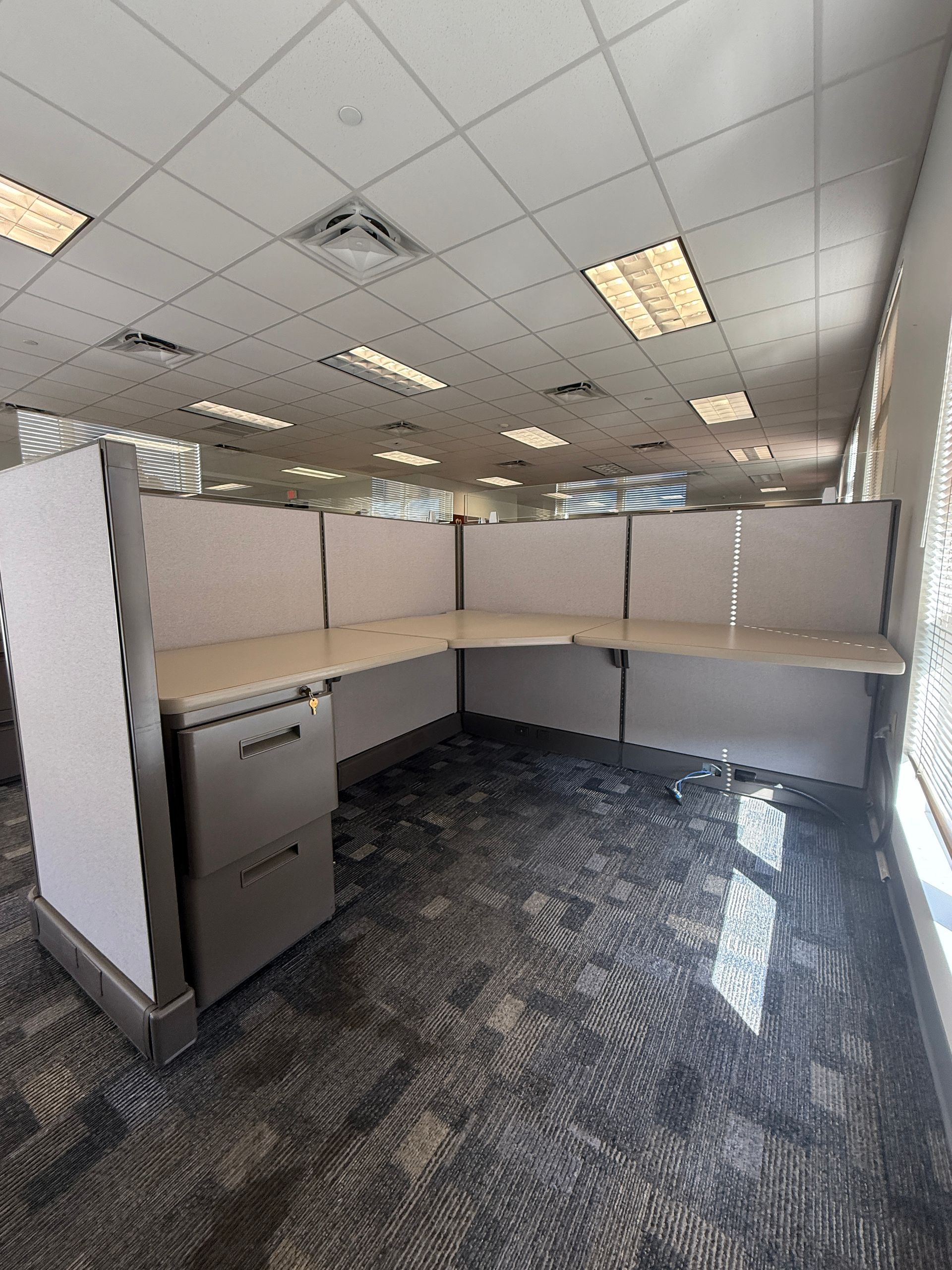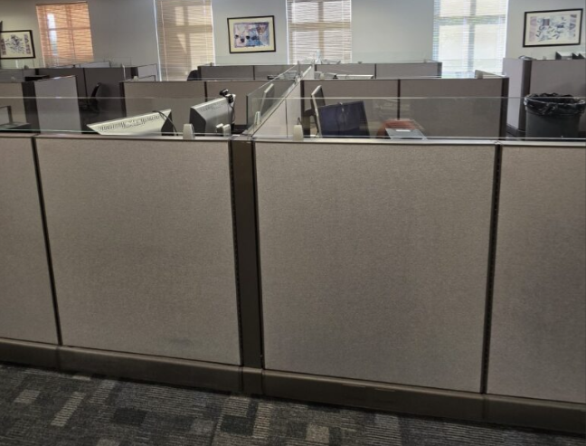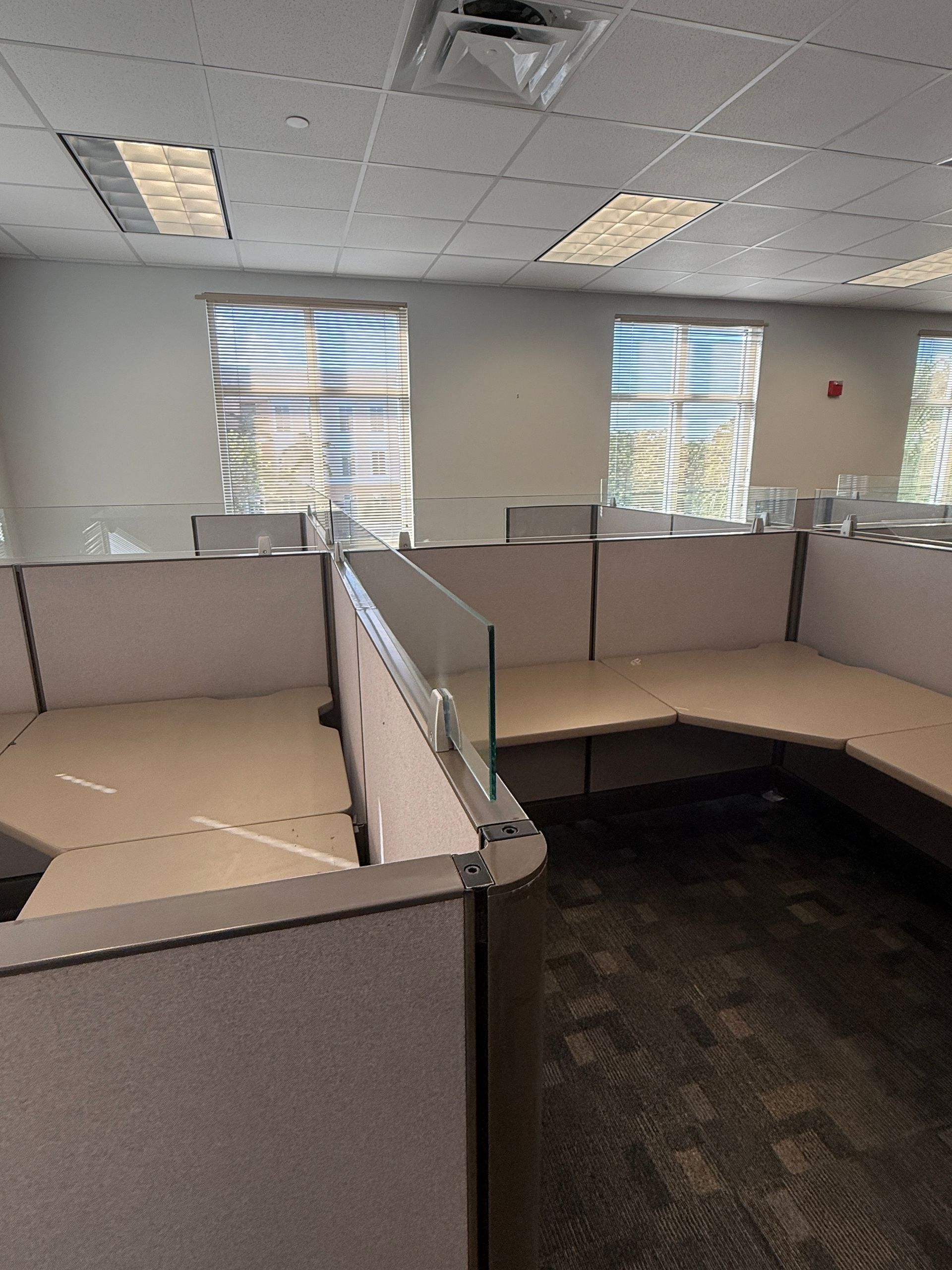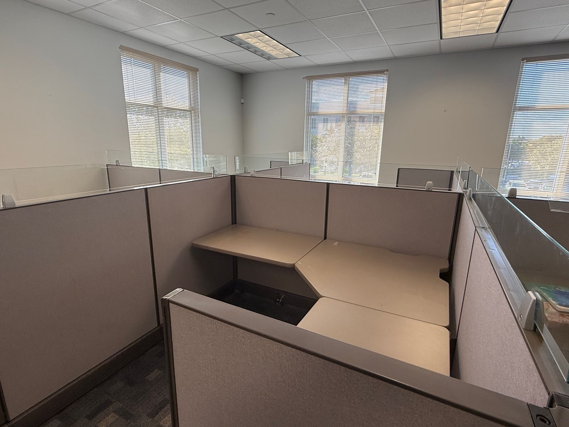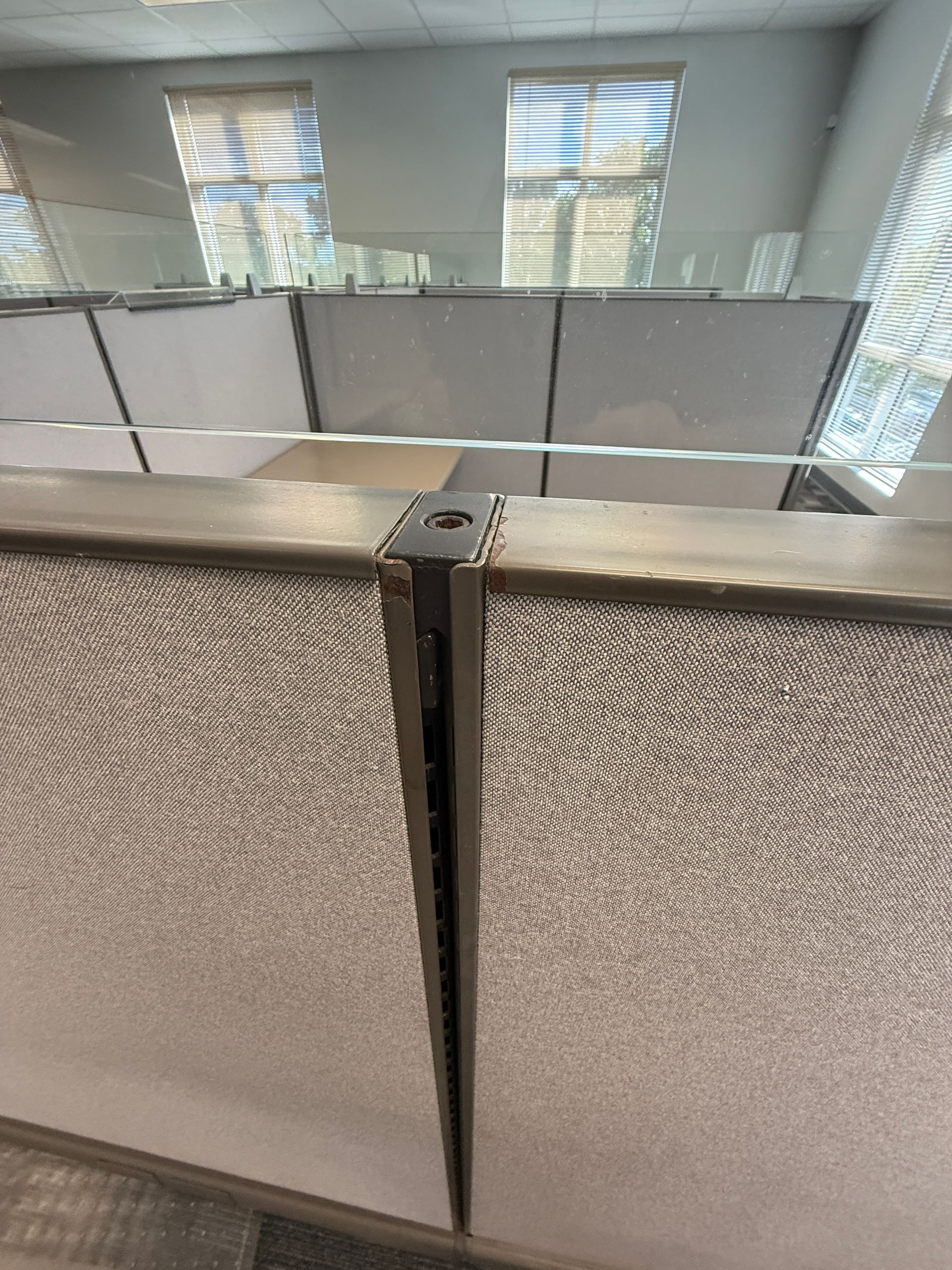 Set of eighteen, Herman Miller A02 cubicles, 72" X 72" X 48"H, file file pedestal, 6" glass toppers, powered raceways, notched corner grommets, HPL surfaces